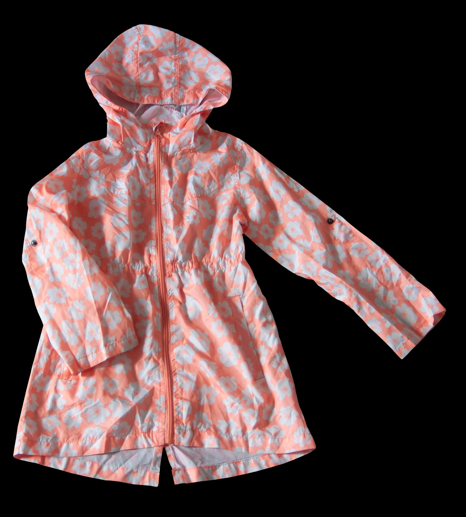 Lehoučká parka zn. YOUNG DIMENSION, vel. 128 (7-8 let). Zapíná se na zip, u krku krytý légou. Vepředu dvě šikmé kapsy. Parka nemá podšívku, je opravdu slaboučká a lehoučká, vhodná na jaro/podzim nebo i v létě na chladnější dny. Kapuce je součástí parky, přišitá napevno. Rukávy jsou zakončeny volně, dají se ohrnout a zapnout na patentku, což je módní a slušivé. V pase je přepásaná nabíranou gumou (pruží), zadní díl je šitý jako delší, do oblouku s rozparkem. Barva je v odstínu nápadné oranžovorůžové, s bílými květy. Na pravém rukávu na pár místech drobně zatržená, proto dávám do 2.jakosti, jinak je krásná. Připravená k okamžitému odeslání.