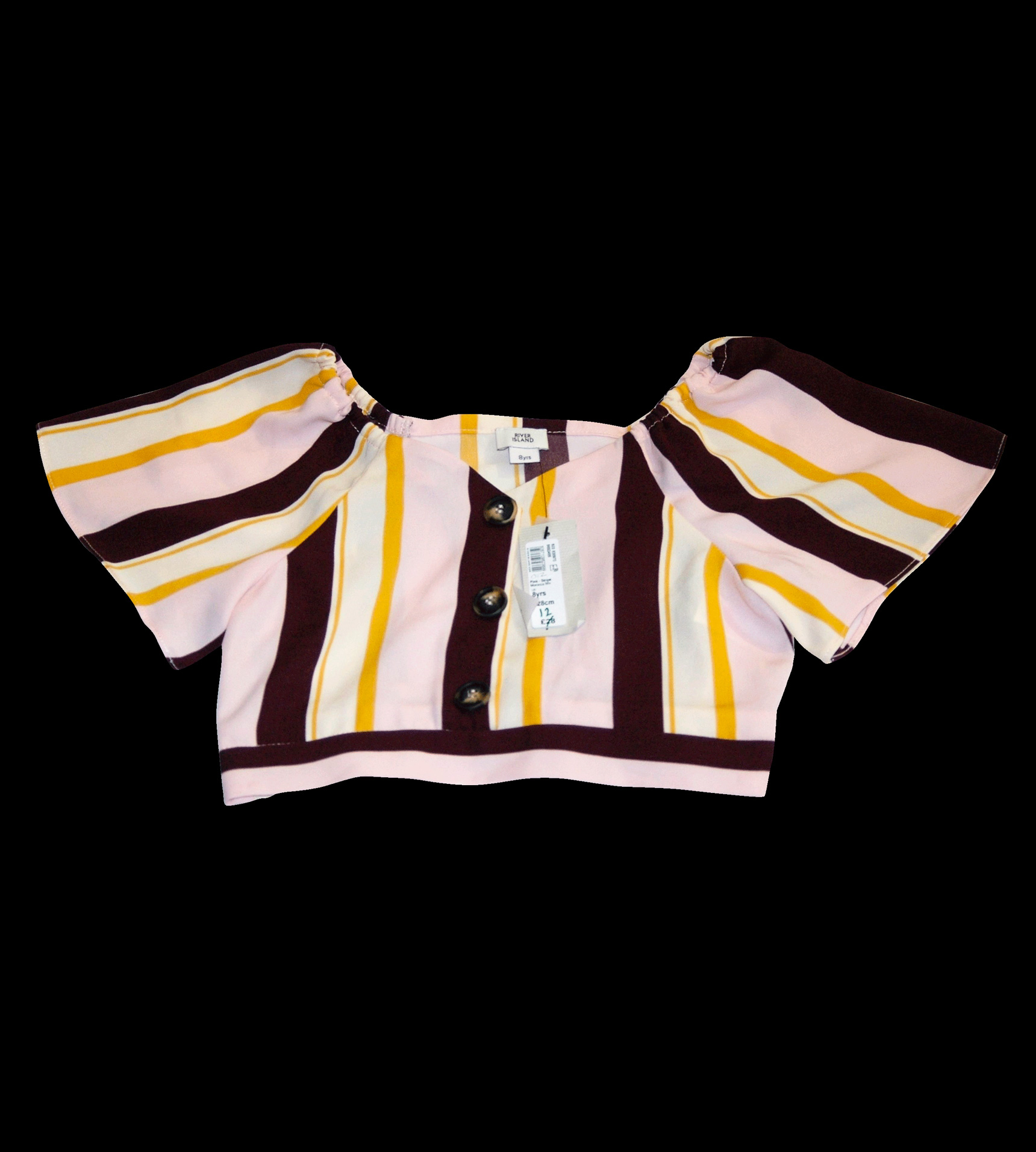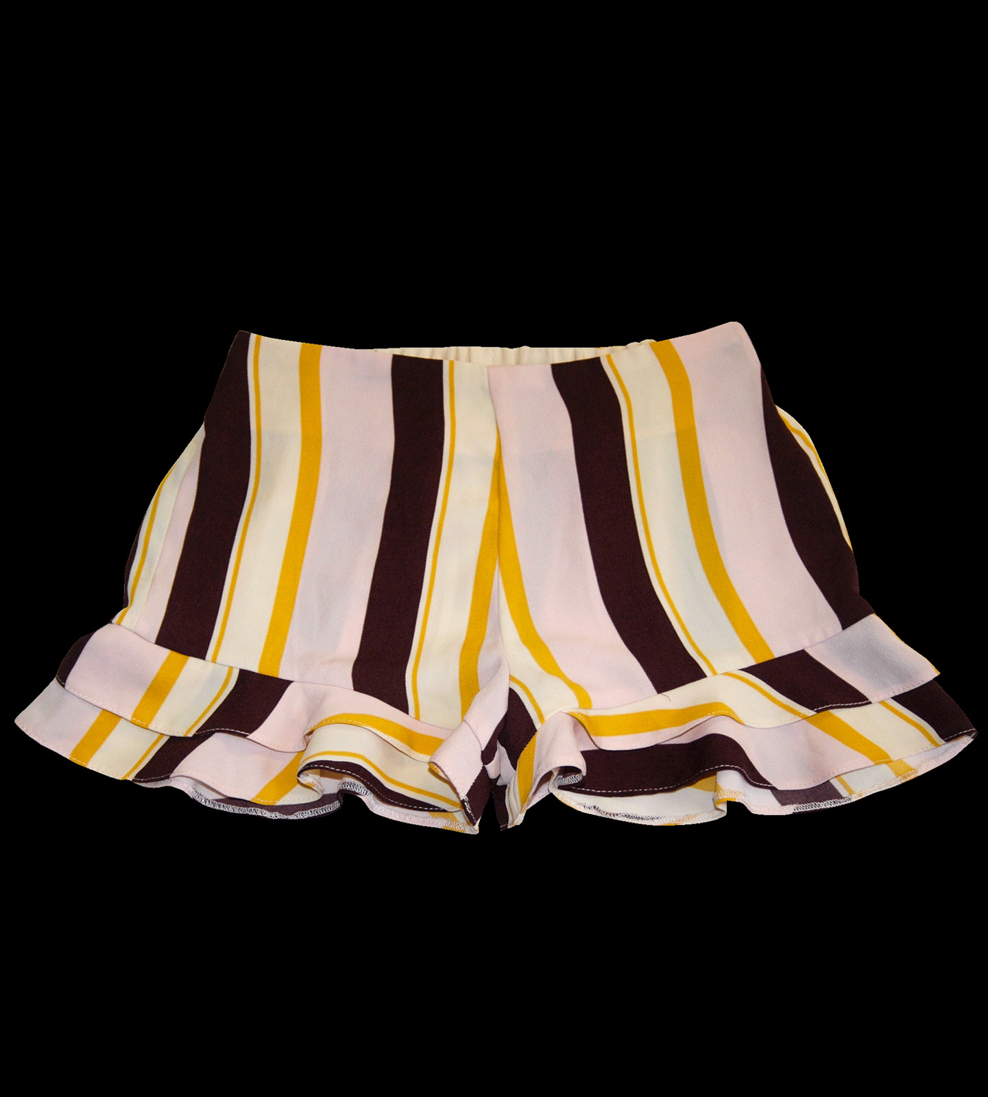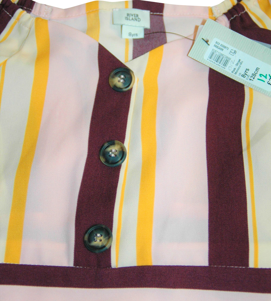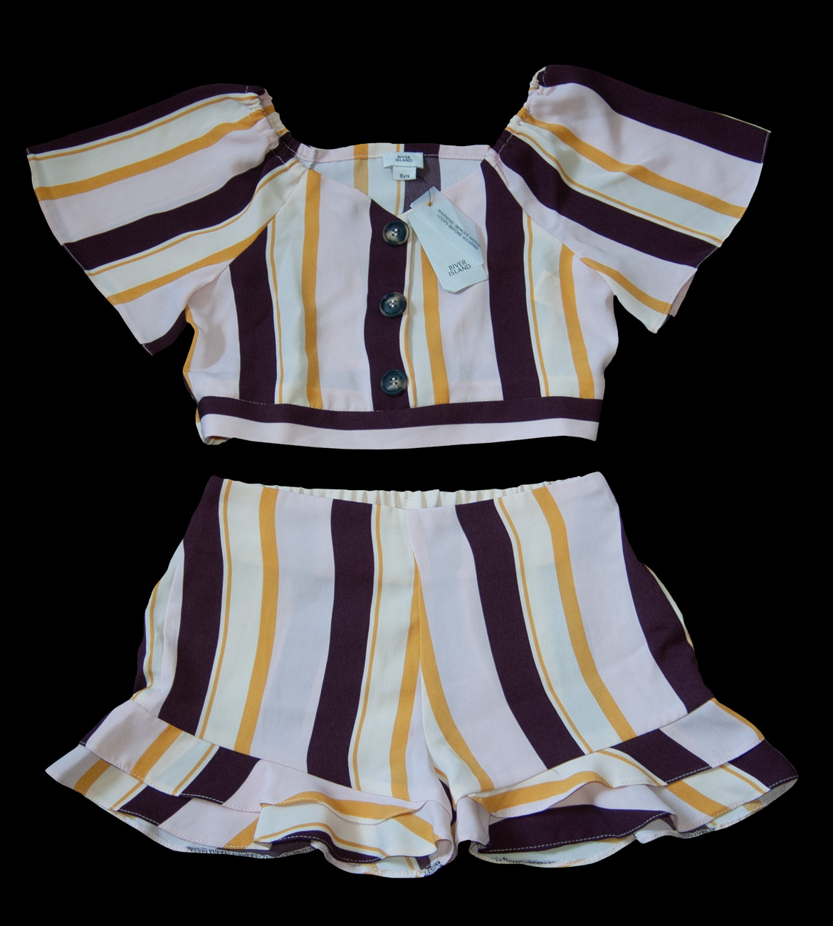 Komplet na léto zn. RIVER ISLAND, vel. 128 (7-8 let). Skládá se z topu nad pupík, zvonové rukávy, spadlá na ramena, oblékání přes hlavu (knoflíky jsou jen dekorační), dole lem vzadní části zakončen nabíranou gumou (pruží), tudíž se hezky přizpůsobí postavě a drží. Dále pak sukňové kraťasy, též vzadní části u pasu guma (pruží), nohavice jsou zakončeny dvěma vrstvenými volány. Pěkný motiv proužků o různých šířkách, v hnědých a žlutých tónech, na broskvovo růžovém podkladě. Pro představu na fotce figurína holčička Sophie (10 let; výška 140 cm; míry Sophie: obvod hrudníku 65 cm, obvod pasu 56 cm, obvod boků 68 cm, obvod stehna 41 cm). Komplet je nenošený ještě i s visačkou, původní cena byla 28 Ł, což je něco přes 800 Kč. Připravený k okamžitému odeslání.