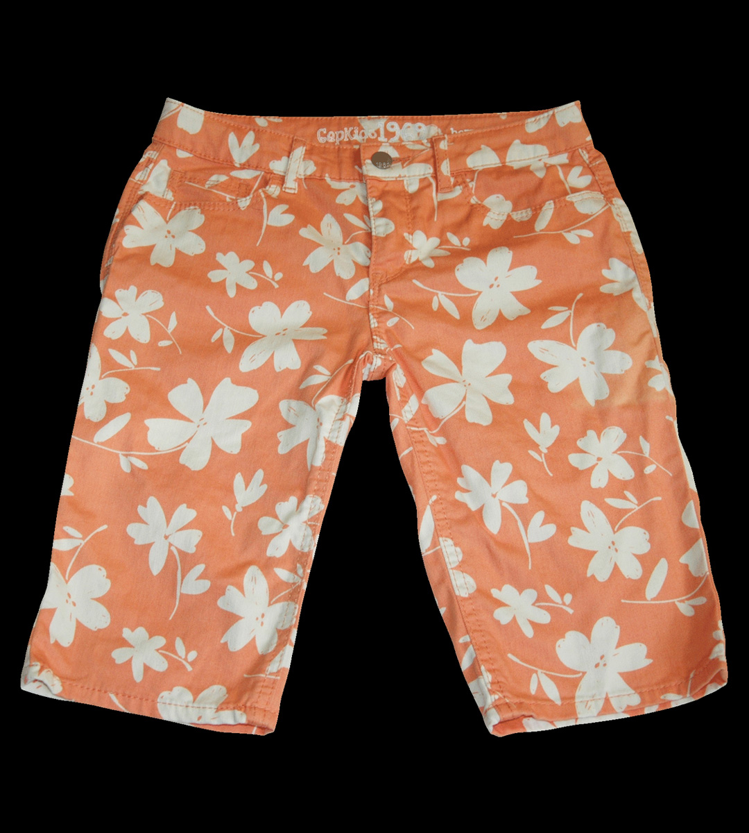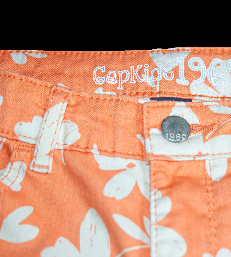 Džínové bermudy zn. GAP, vel. 158 (12-13 let). Spousta kapes, krásný motiv velkých bílých květů na korálovém pozadí (něco mezi růžovou a oranžovou, světlejší než na fotu), v pase regulační guma, zapínání na knoflík a zip. Na levé straně v malém kousku vyšisované (světlejší odstín), není ani vidět, jinak pěkný stav, připravené k okamžitému odeslání.
