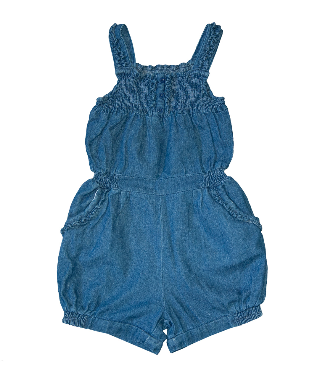 Kraťasy s laclem, zn. GEORGE, vel. 104 (3-4 roky). Džínové kraťasy jsou zdobené volánky a žabičkovou gumou. Na bocích též žabičková guma, kolem kapes volánky, dvě kapsičky vepředu. Jsou z měkké džínoviny (100% bavlna). Pro představu na fotce figurína holčička Elza (5 let; výška 110 cm; míry Elzy: obvod hrudníku 55,5 cm, obvod pasu 50 cm, obvod boků 60 cm, obvod stehna 33 cm), dle fotek může nosit i větší dívka. Top stav, bez vady, připravené k okamžitému nošení.