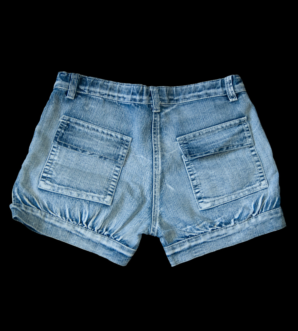 rozměry: délka 27 cm, šířka v pase 2x 34,5 cm, šířka v bocích 41 cm, výška sedu vpředu 21 cm, vzadu 26 cm, obvod nohavice 42,5 cm