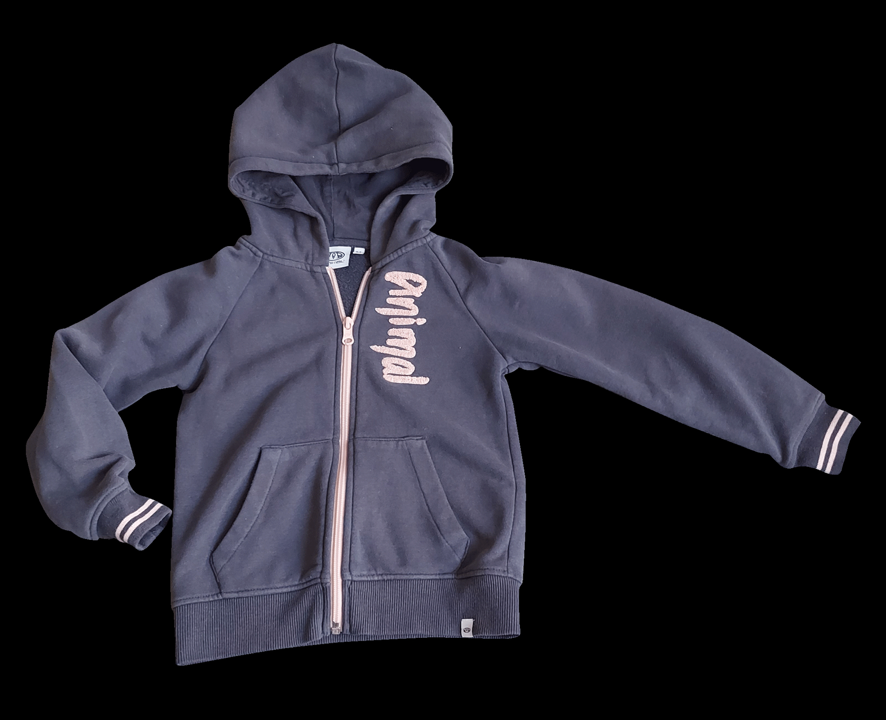 Mikina zn. ANIMAL, vel. 110/116 (4-6 let). Nezateplená, zapínání na zip, dvě kapsy, rukávy zakončeny manžetou. Švestkově modrá s růžovými doplňky s vyšitým nápisem „ANIMAL“. Je jako nová bez poničení, perfektní stav. Připravená k okamžitému odeslání.