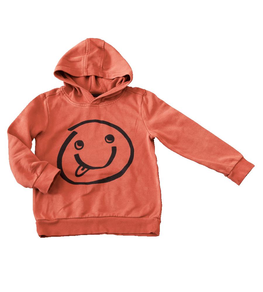 Mikina zn. GEORGE, vel. 110/116 (4-6 let). Mikina je větší, spíše odpovídá velikosti 116. Slabá, tenká nezateplená. Obléká se přes hlavu, s kapucí, bez kapes. Obrázek velkého smajlíka s vypláznutým jazykem. Barva korálová (červenooranžová). Mikina nese běžné známky nošení.