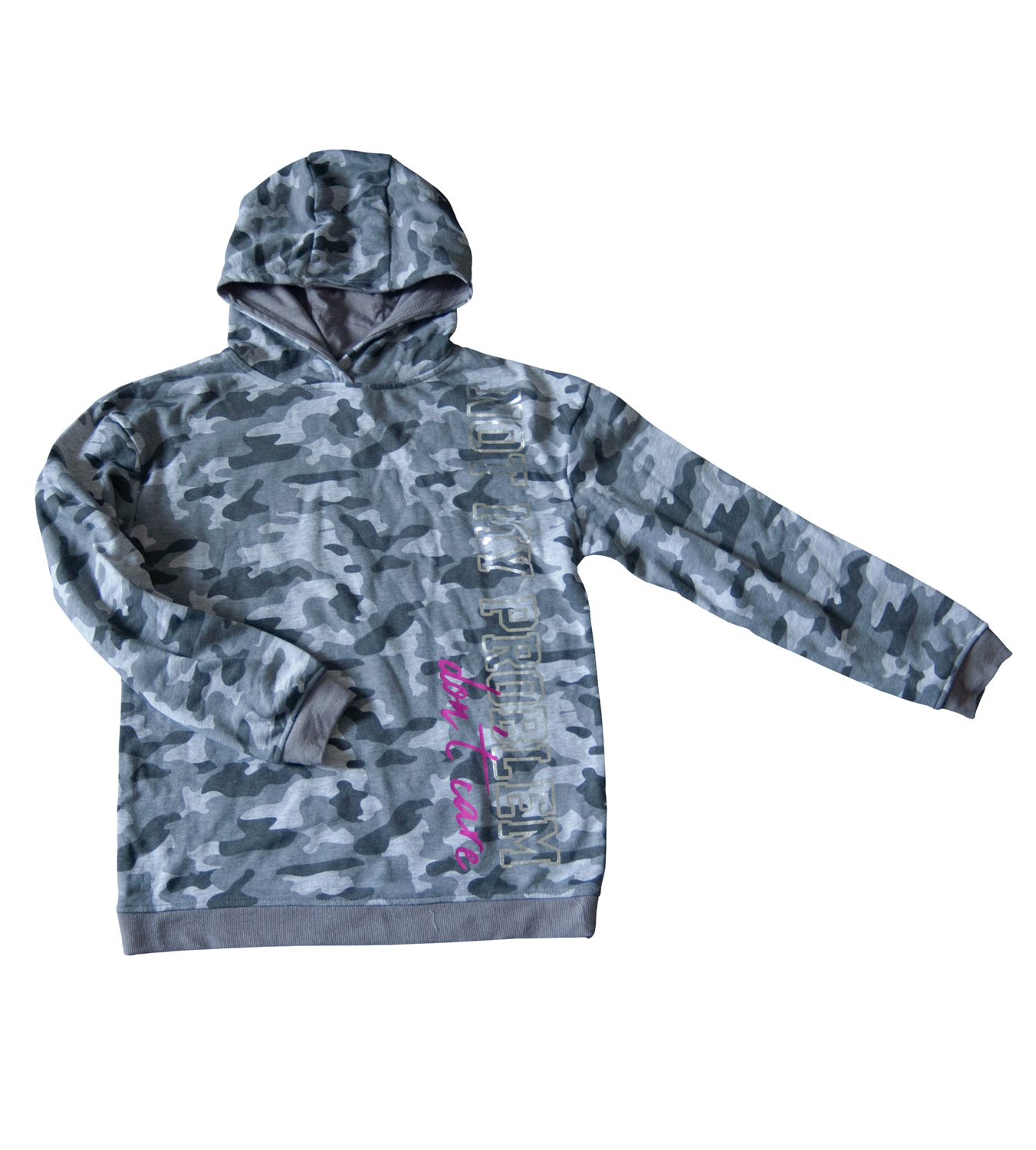 Mikina zn. PRIMARK, vel. 164 (13-14 let). Obléká se přes hlavu, je slabá nezateplená, s kapucí, bez kapes. V odstínech šedé maskáčoviny se stříbrným nápisem "není to můj problém" a pod ním růžový dovětek "nezajímá mě to". Nemá žádnou vadu, TOP stav, minimálně nošená, takže jako nová.