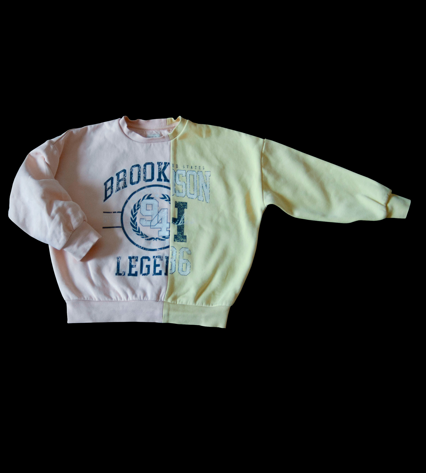 Mikina zn. F&F, vel. 122 (6-7 let). Obléká se přes hlavu, bez kapuce, bez kapes. Pastelové barvičky růžové a žluté doplňují černobílé nápisy. TOP stav, bez vad, minimálně nošená jako nová.