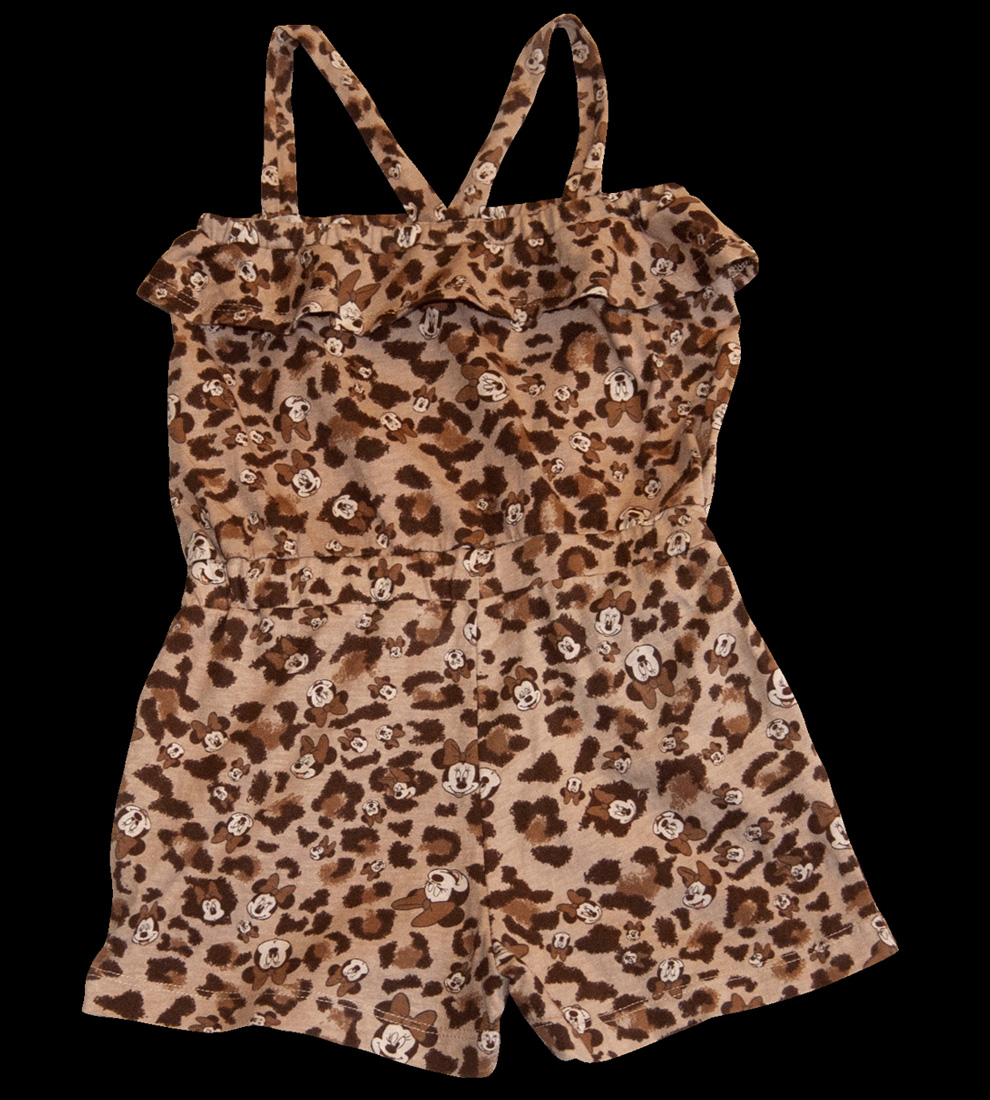 Roztomilý overálek na úzká ramínka, zn. H&M, vel. 98/104 (2-4 roky). V horní polovině nabíraná guma a volánek kolem hrudníku. V pase guma a vpředu dvě kapsičky, na jedné z nich natisknutý výrazný růžový nápis „Minnie“. Bavlněný, ideální na horké dny, výlety, k vodě apod. Hnědý se zvířecím motivem šelmy a hlavičky Minnie. Pro představu na fotce figurína holčička Elza (5 let; výška 110 cm; míry Elzy: obvod hrudníku 55,5 cm, obvod pasu 50 cm, obvod boků 60 cm, obvod stehna 33 cm). Perfektní stav, bez poničení, připravený k okamžitému odeslání a nošení.