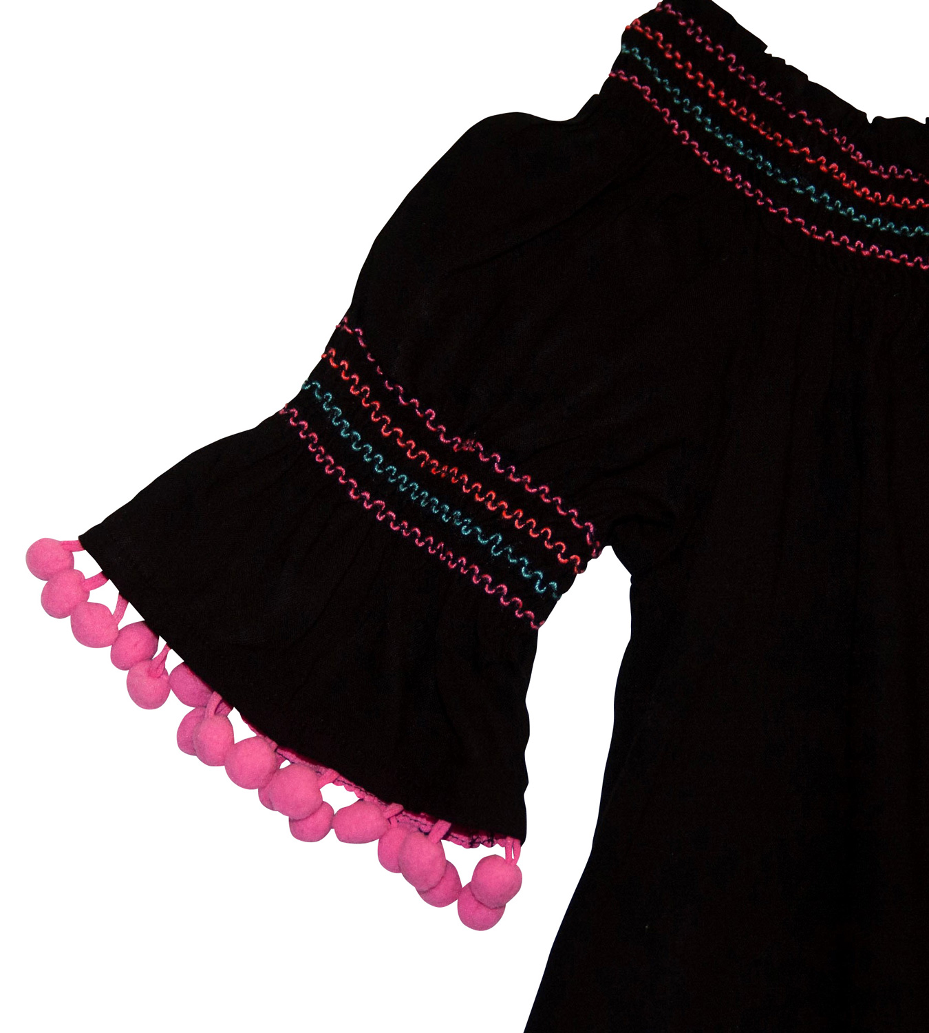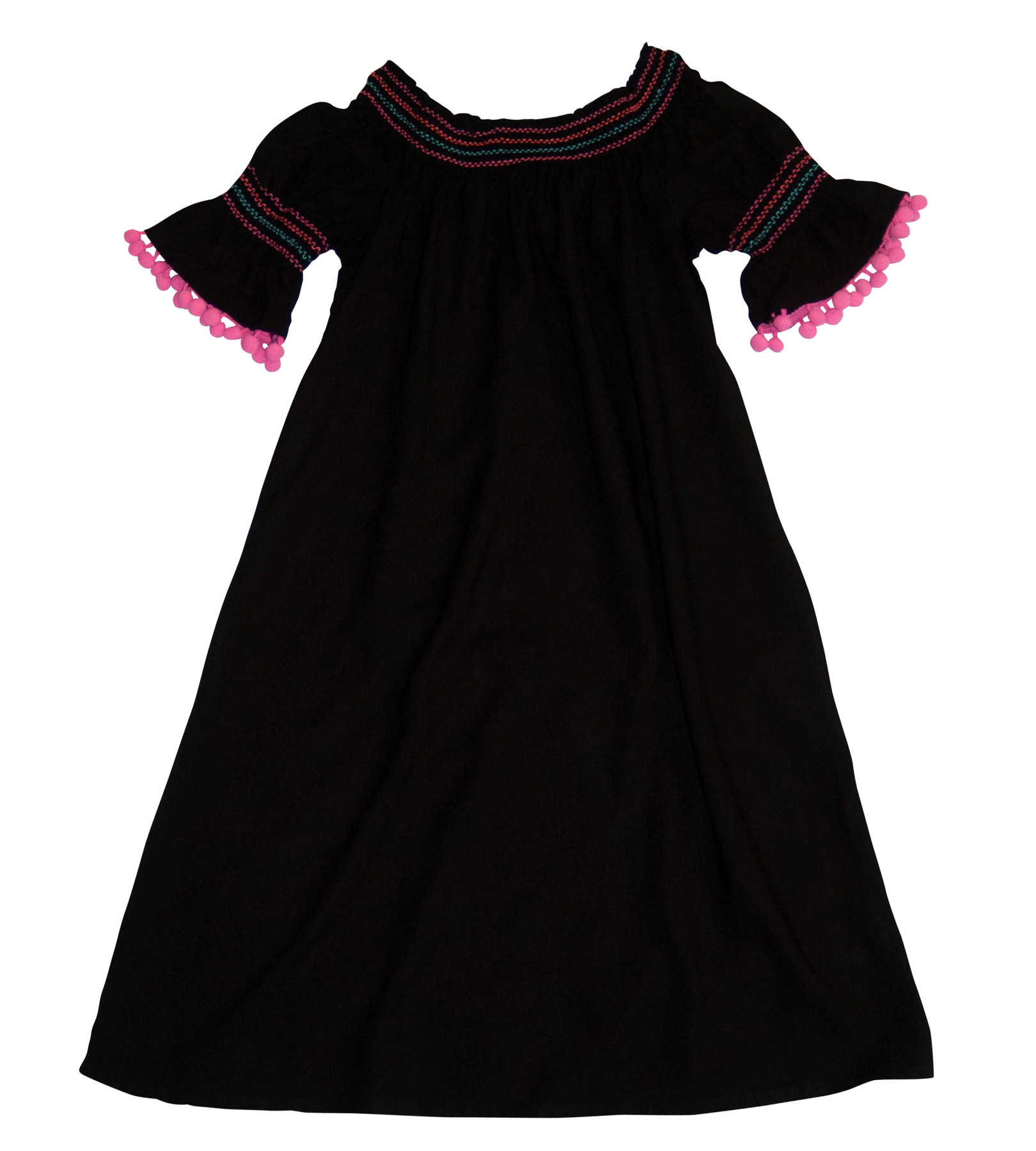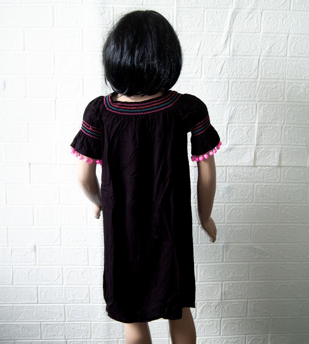 Letní černé jednoduché šaty, zn. CANDY COUTURE, vel. 146 (10-11 let). Šaty mají krátké rukávy, na kterých je barevné vyšívání a jsou zakončeny růžovými bambulkami, tu stejnou výšivku mají kolem celého dekoltu. Od krku dolů jsou nabírané, jednoduchý střih A (směrem dolů se rozšiřují). Černá barva v kombinaci barevné výšivky působí kontrastně a přesto decentně. Hodí se k jakýmkoliv barevným doplňkům a na jakoukoliv příležitost. Pro představu na fotce figurína holčička Sophie (10 let; výška 140 cm; míry Sophie: obvod hrudníku 65 cm, obvod pasu 56 cm, obvod boků 68 cm). TOP stav, absolutně bez vady. Jsou chladivé a příjemné na těle, 100% viskóza (umělé hedvábí), připraveny k okamžitému nošení.