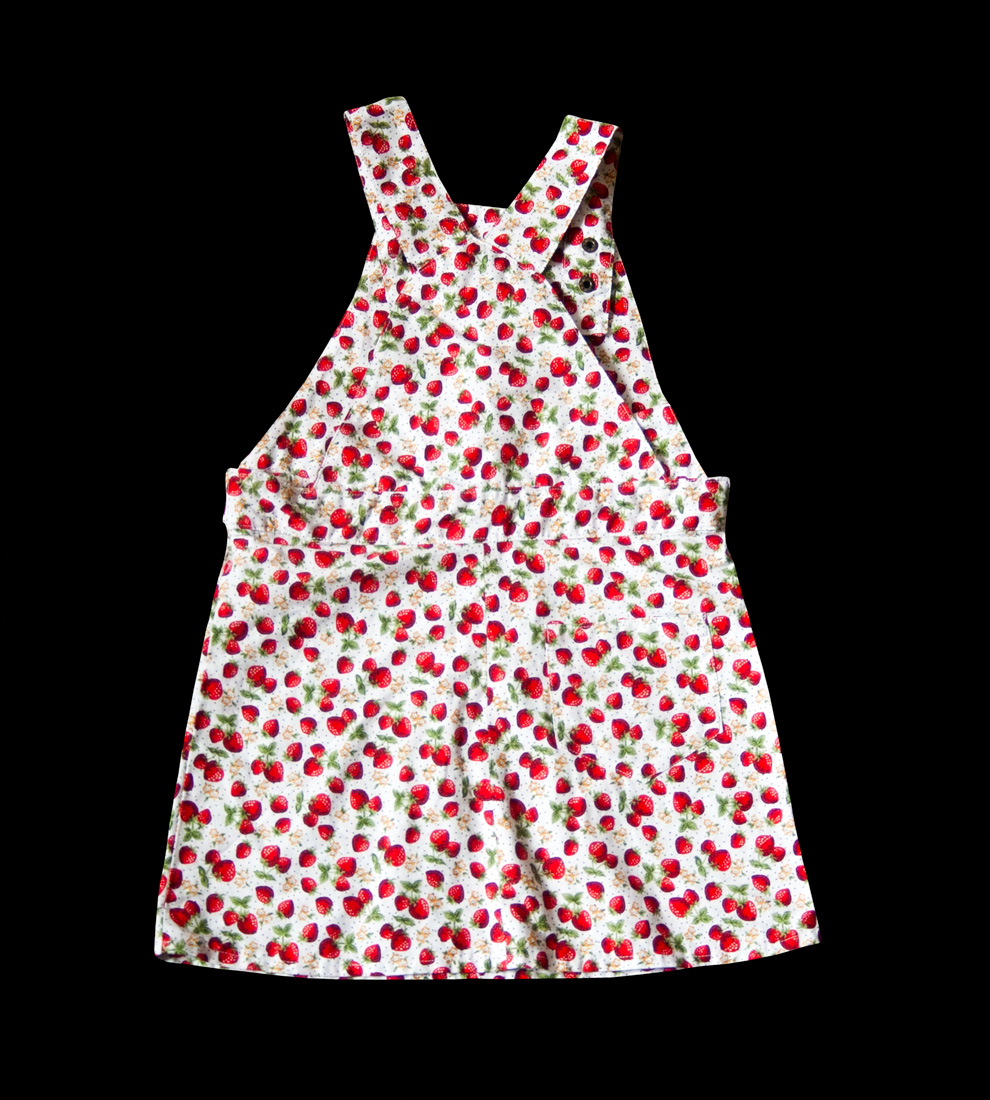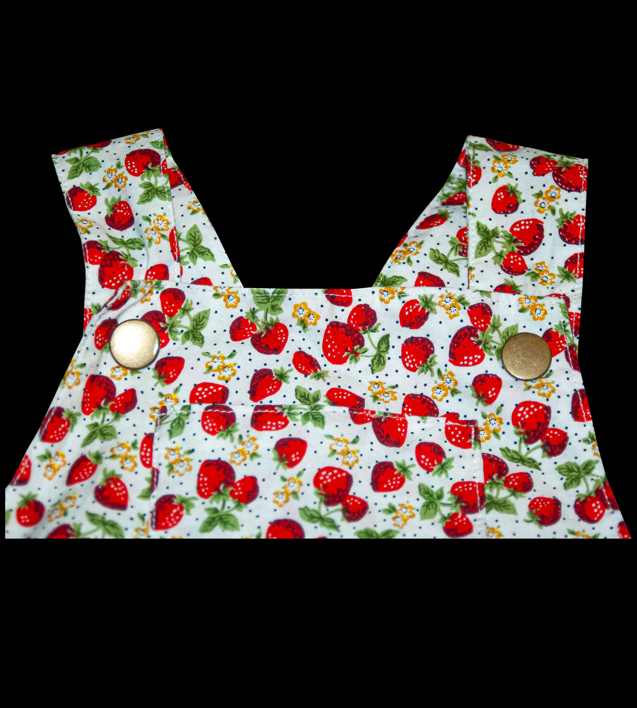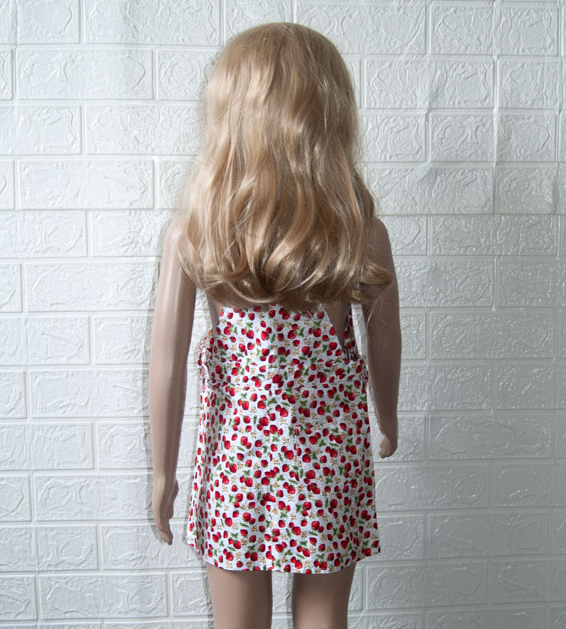 Jahodové šaty, vel. 104/110 (3-5 let). Šaty s laclem, vepředu na prsou kapsička a též ještě jedna vzadu. Kromě zapínání laclu ještě po stranách (na bokách) rozepínací na patentky. Jsou bílé, posety sladce červenými jahodami. Pro představu na fotce figurína holčička Elza (5 let; výška 110 cm; míry Elzy: obvod hrudníku 55,5 cm, obvod pasu 50 cm, obvod boků 60 cm). Byly asi jen 1x oblečeny, top stav, absolutně bez vady jako nové. Jsou bavlněné, 100% bavlna (plátno), moc příjemné v horkých dnech. Jsou připraveny k okamžitému nošení.