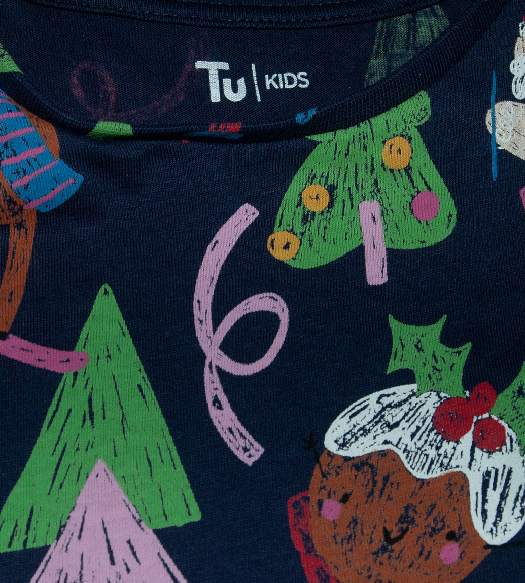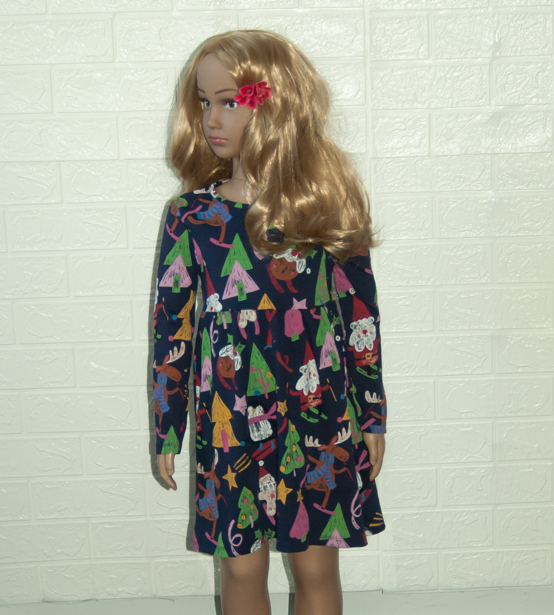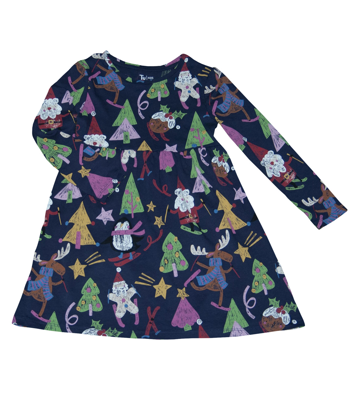 Vánoční šaty zn. TU, vel. 110 (4-5 let). Krásné šatičky na advent, štědrý den, Vaše vánoční focení (ve školce, doma) nebo jako vánoční dárek. Od pasu dolů jsou lehce nabírané, klasický střih A (směrem dolů se rozšiřují). Vánoční motiv stromečků, Santů, sobů atd. Jsou tmavomodré barvy s barevnými obrázky. Kvalitní, krásné, vyrobené v Bangladéši. Pro představu na fotce figurína holčička Elza (5 let; výška 110 cm; míry Elzy: obvod hrudníku 55,5 cm, obvod pasu 50 cm, obvod boků 60 cm). Dá se říci, že jsou nové bez visačky. Připravené k okamžitému odeslání.