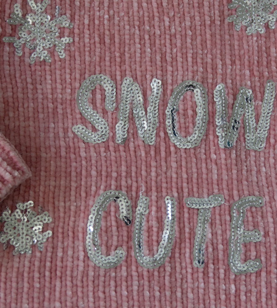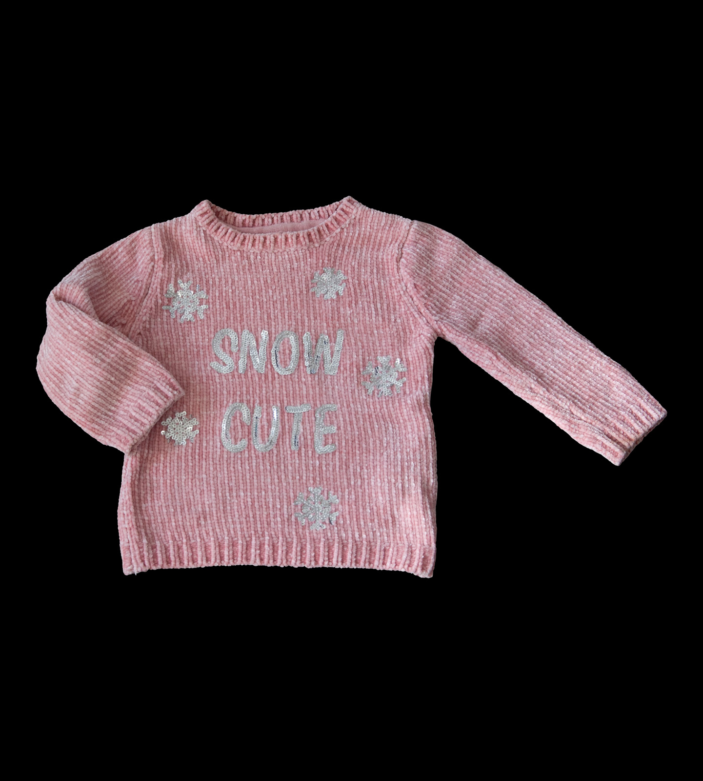 Zimní heboučký svetr zn. PRIMARK, vel. 104 (3-4 roky). Obléká se přes hlavu, zakončení do lemů. Parádní na advent, štědrý den, na vánoční focení (ve školce, doma) nebo jako vánoční dárek. Barva je šedorůžovobílá, třpytivý stříbrný nápis (z flitrů) "roztomilý sníh" a vločky. Dá se říci, že svetr je nový, žádné známky nošení, připravený k okamžitému odeslání.