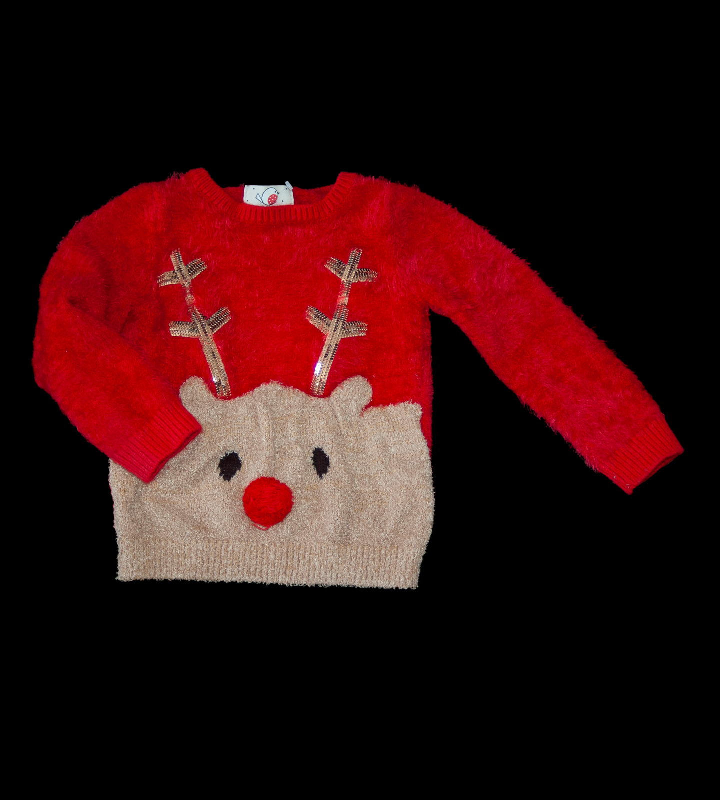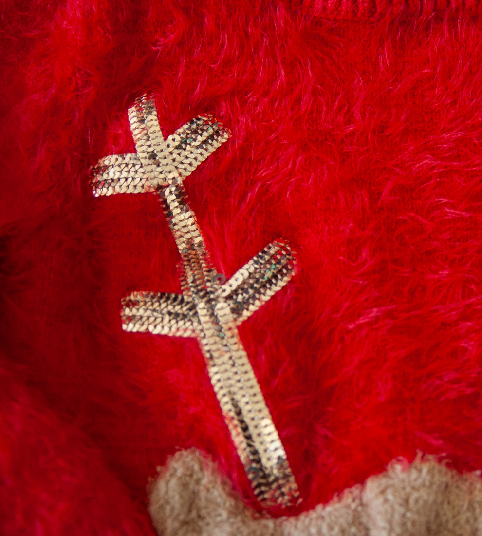 Kouzelný heboučký jemný svetr zn. GEORGE, vel. 104 (3-4 roky). Obléká se přes hlavu. Parádní na advent, štědrý den, na vánoční focení nebo jako vánoční dárek. Červená jasná barva s obrázkem soba a parohy z flitrů. Příjemný materiál, top stav. Nový bez visačky, zůstal držáček po cedulce, připravený k okamžitému odeslání.