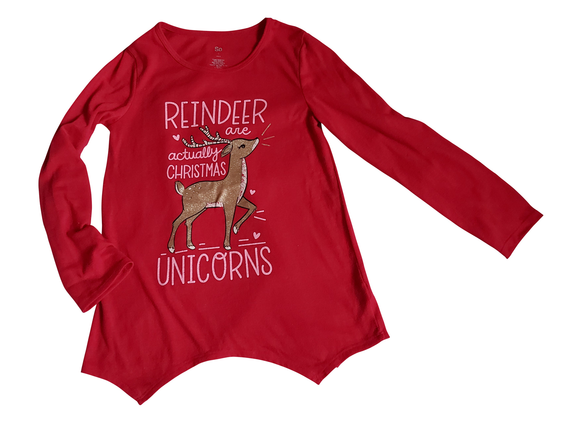 Triko/Tunika zn. SO s vánočním motivem zlatého soba, vel. 152 (11-12 let). Tunika je zakončená ve spodní části moderními cípy, menší drobnější dívka může nosit jako delší tuniku k legínám. Zachovalá, perfektní stav, bez poškození.