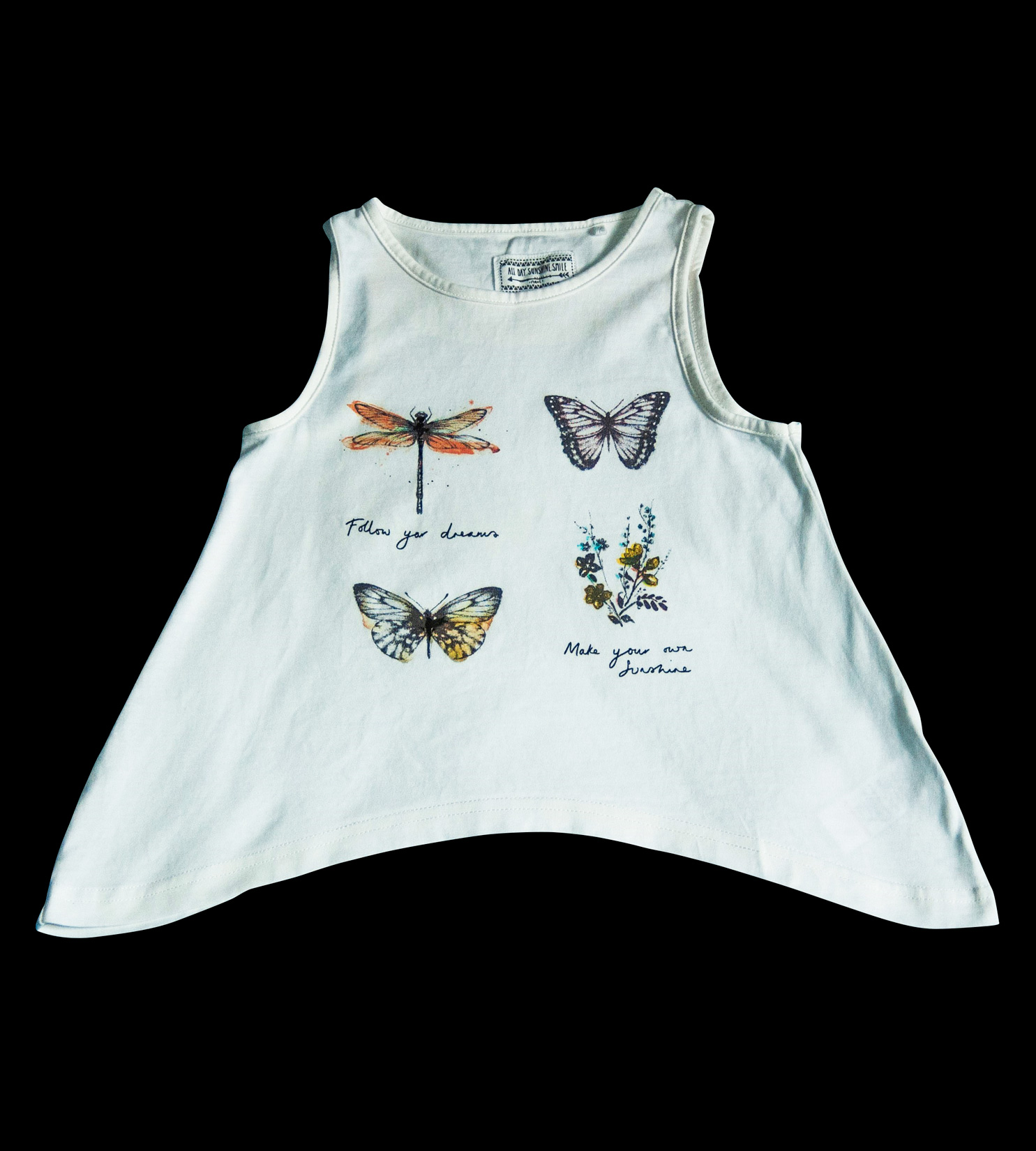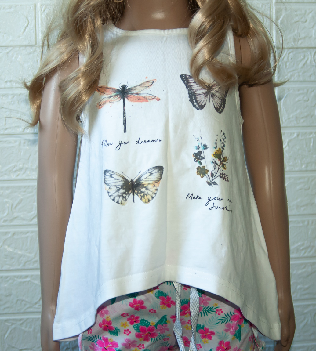 Tunika zn. NEXT, vel. 110 (4-5 let). Parádní tunika na teplé letní dny, jednoduchý střih A (směrem dolů se rozšiřuje). Šitá do oblouku, což tvoří dva módní cípy ze stran. Bílá, s potiskem opravdových motýlů a vážky. Nápisy: "Následuj své sny" a "Vytvoř si své vlastní slunce". Pro představu na fotce figurína holčička Lola (5 let, výška 110 cm). TOP stav, bez vad, připravená k okamžitému odeslání a nošení.