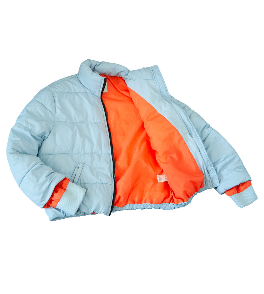 Lehoučká teplá zimní bunda od zn. RIVER ISLAND, vel. 140 (9-10 let). Zapínání na zip, vpředu dvě nezapínací kapsy, bez kapuce. Celá bunda je uvnitř lehce zateplená vatelínem a je vodorovně prošitá ve volných pruzích, což tvoří jemné buřtíky. Podšívka je ze silné, lesklé, šusťákové, svítící, kontrastní oranžové barvy. Rukávy mají všité vnitřní modré manžety v barvě bundy a jsou našité na oranžové podšívce. Jednoduchá, jednobarevná. Pro představu na fotce figurína chlapec Jake (10 let, výška 140 cm). Barva je ledová modrá, suprová na zimu, slušivá. Bunda je v bezva stavu, neopraná, moc pěkná. Připravená k okamžitému odeslání.