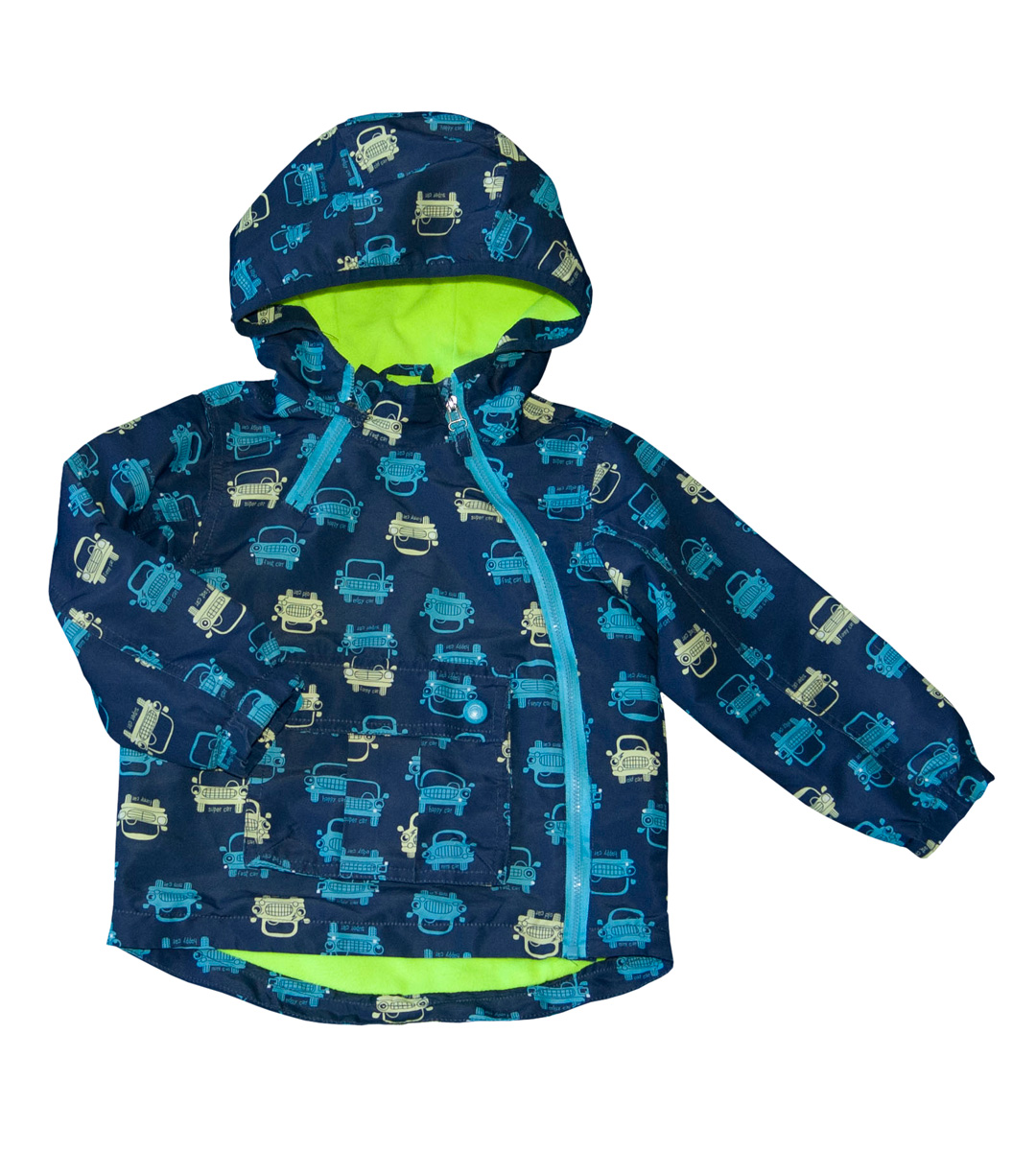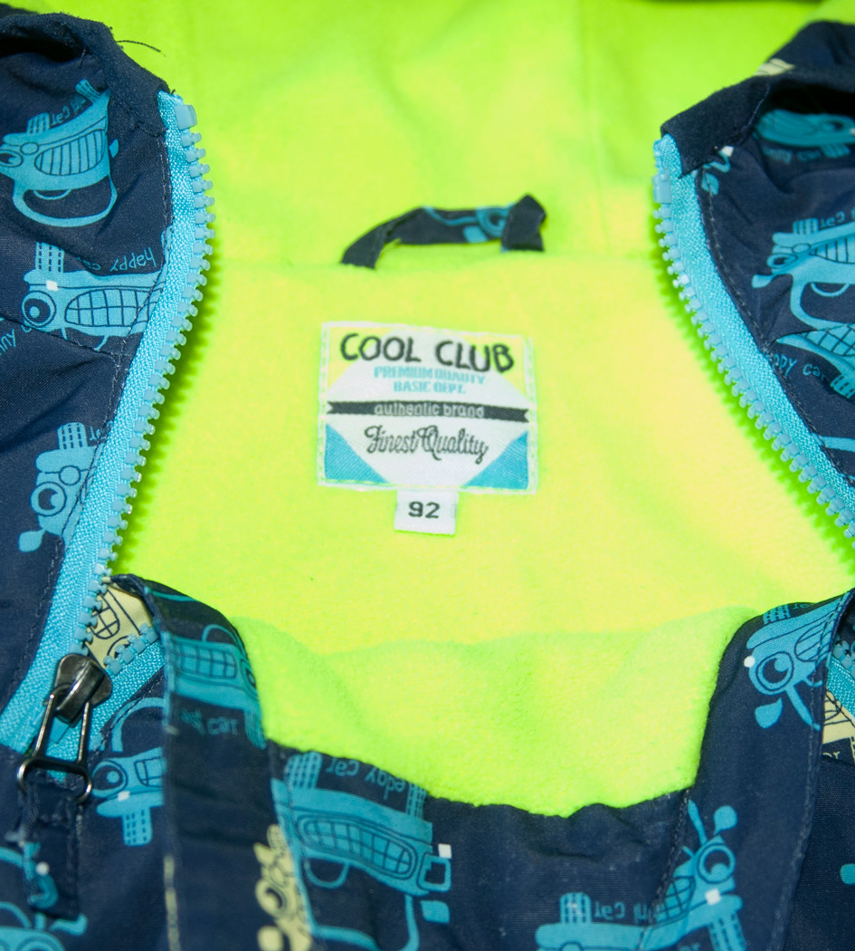 Šusťáková bunda zn. COOL CLUB, vel. 92 (1,5-2 roky). Zapínání na zip do oblouku a druhý zip jen částečně u krku, oba kryté légou, vpředu jedna velká kapsa na patentky. Bunda má fleecovou jemnou svítivě zelenou podšívku, v rukávech jen podšívka ze šusťákoviny. Je lehoučká, módní, slušivá a teplá, ideální na první jarní dny. Kapuce je součástí bundy, přišitá napevno. Bunda je šitá do oblouku, zadní díl šitý jako delší, rukávy jsou zakončeny nabíranou gumou. Barva je v odstínu námořnické modré se světle modrými a žlutými autíčky. Top stav, parádní, je nošená, tudíž nemohu dát do kategorie cream, ale je bez vad. Připravená k okamžitému odeslání.