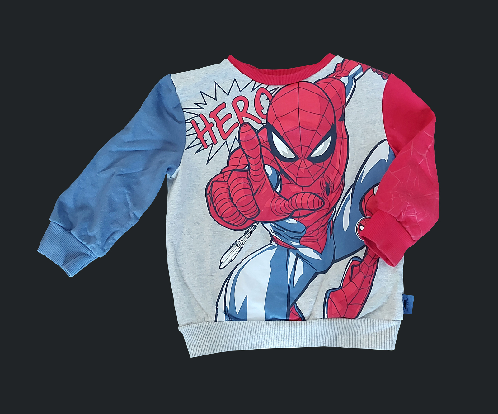 Mikina zn. GEORGE vs MARVEL, vel. 98/104 (2-4 roky). Bez kapuce, bez kapes. Jemně zateplená chloupkem (flauš), oblékání přes hlavu, motiv Spidermana, krásně barevná a výrazná. Na levém červeném rukávu potisk pavučiny. Mikina je v pěkném stavu, ale má jedinou vadu, skvrnu od odbarvovače, je vespod na levém (modrém) rukávu, viz foto, není na první pohled vidět. Zohlednila jsem v ceně, až na tu skvrnu vypadá jak nová.
