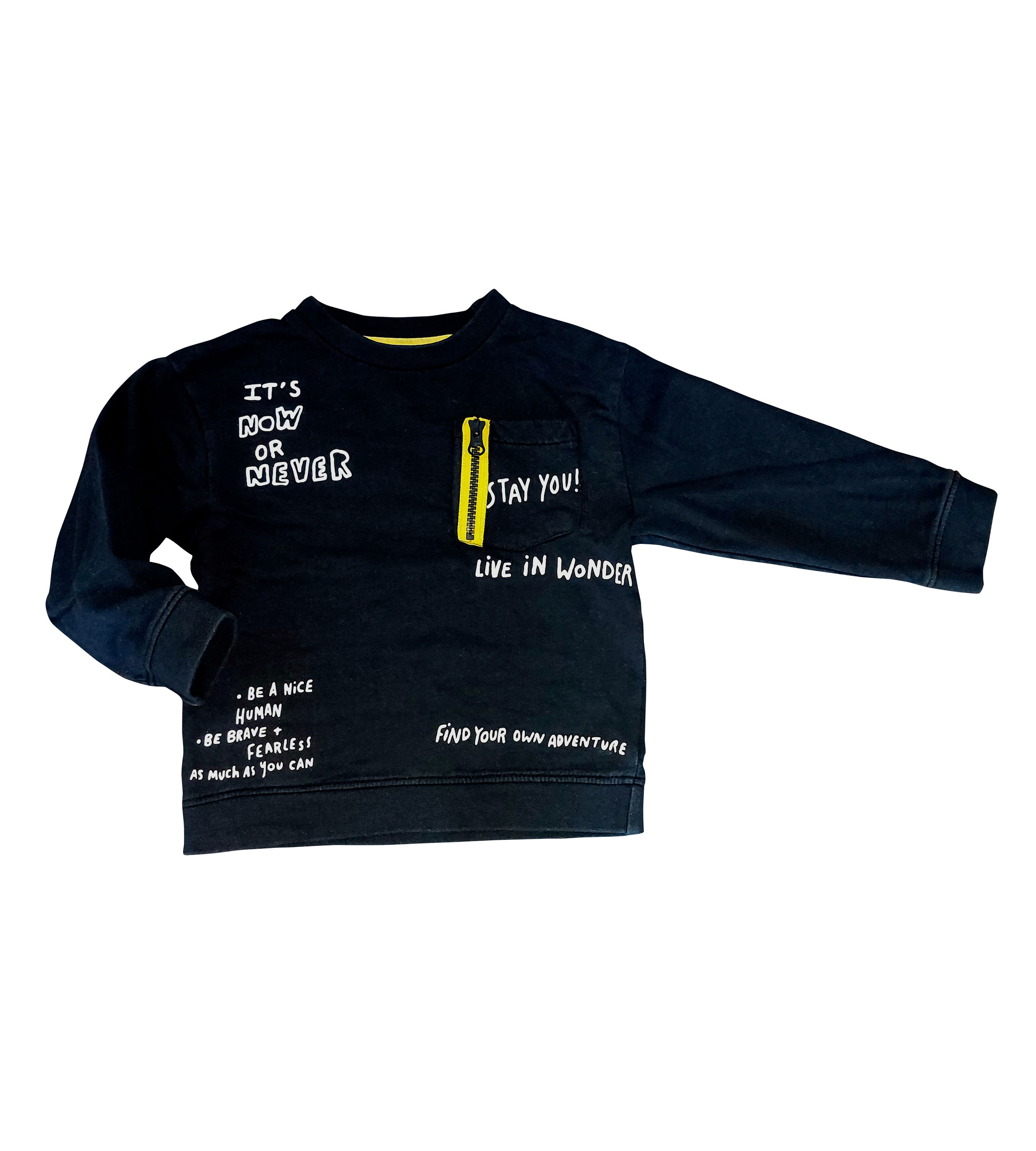 Mikina zn. MY K, vel. 104 (3-4 roky). Slabá, tenká mikina, uvnitř jemně potažena chloupkem. Oblékání přes hlavu, jedna náprsní kapsička, bez kapuce. Vkusně sladěné barvy, kombinace černé, žluté a bílé. Na kapse dekorativní zip (funkční). Spousta nápisů (výkřiků) v bílé barvě: "Teď nebo nikdy", "Zůstaň", "Život v údivu", "Najdi si svoje dobrodružství", "Buď milý člověk", "Buď statečný a nebojácný jak jen to jde" . Minimálně nošená, perfektní stav. Připravená k okamžitému odeslání.