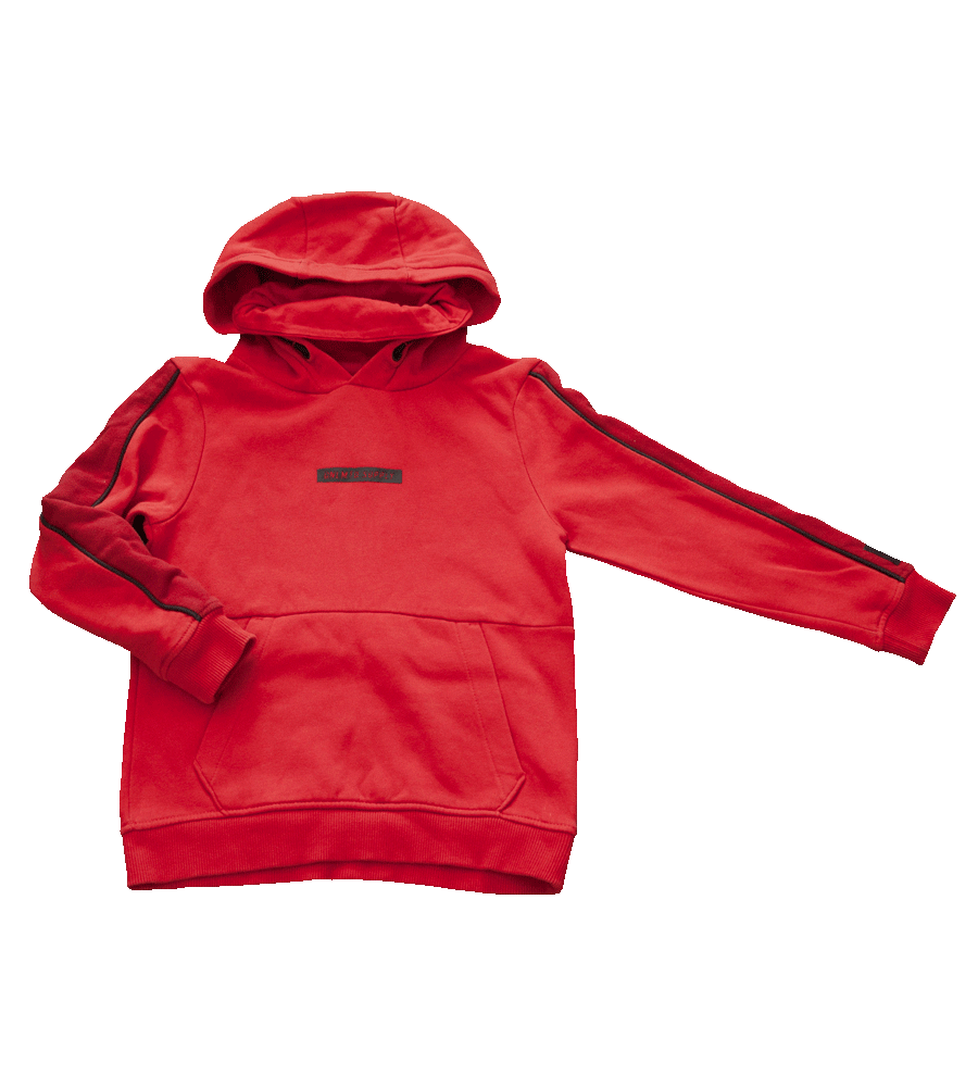 Mikina zn. GEORGE, vel. 128/134 (7-9 let). Oblékání přes hlavu, s kapucí a velkou klokaní kapsou. Všitý bavlněný nákrčník (rolák) s drobným nápisem. Zateplená flaušem, černé nápisy i na rukávu, jahodová červená barva v kombinaci tmavšího červeného pruhu na rukávech, s doplňkem černé. Perfektní stav, jako nová, připravená k okamžitému odeslání.