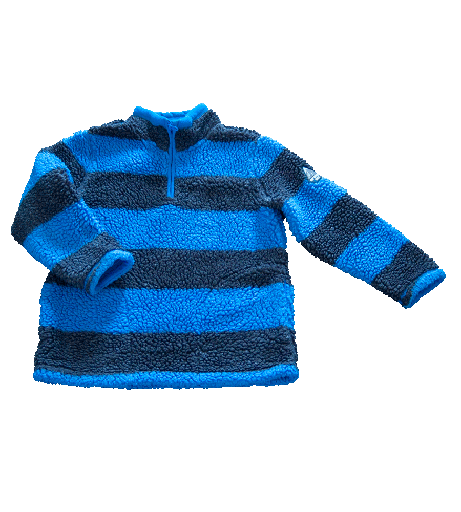 Mikina zn. GAP, vel. 122 (6-7 let). Mikina je teplá, silná. Obléká se přes hlavu, od krku do 1/4 zip, bez kapuce, ze strany dvě velké kapsy. Na rukávu outdoorová značka. V módní proužkové černomodré barvě. Pěkný stav, připravená k okamžitému odeslání.