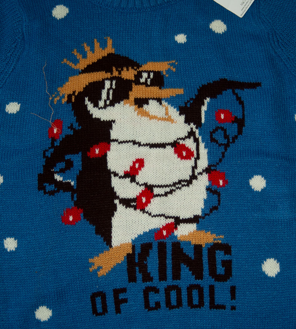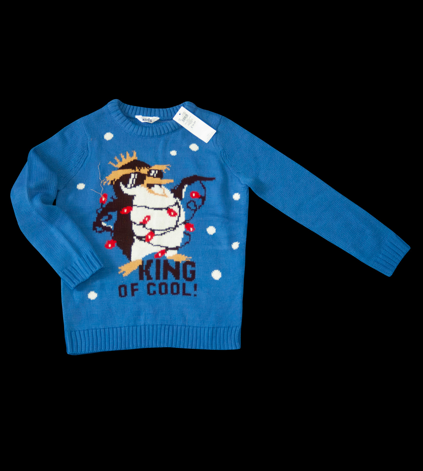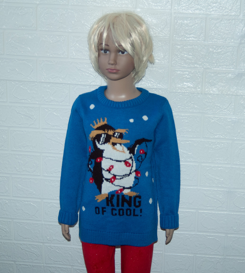 Pěkný teplý silný svetr od zn. M&Co, vel. 116 (5-6 let). Obléká se přes hlavu. Parádní na adventní dny do školy, štědrý den, vánoční focení, besídka nebo jako vánoční dárek. Svetr je silný ze 100% akrylu, kvalitní. Přední strana je zesílená (dvojitá), moc pěkný, šitý v Bangladéši. Obrázek tučňáka a nápis "král pohody". Barva modrá Mambo. Pro představu na fotce figurína chlapec Ben (5 let, výška 110 cm). Nový s visačkou, připravený k okamžitému odeslání.