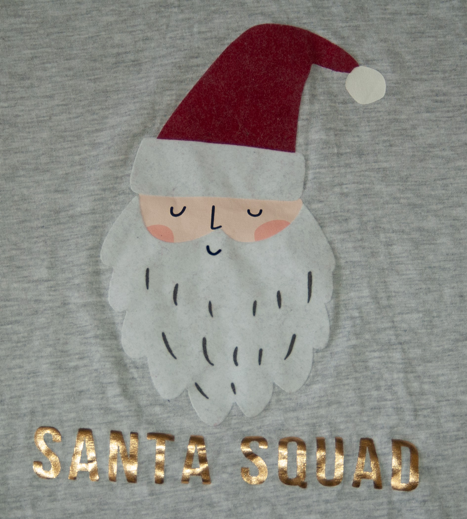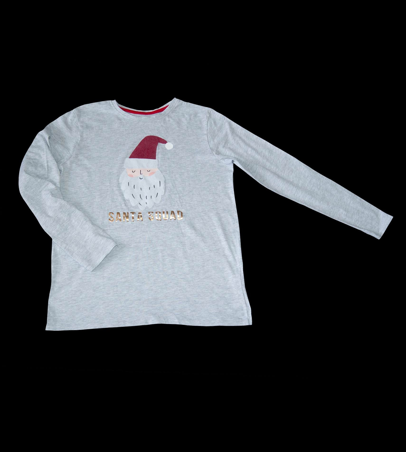 Triko zn. PRIMARK, vel. 164 (13-14 let). Na advent, štědrý den, prosincové dny ve škole, besídku nebo Vaše vánoční focení. Triko je světle šedé melírové s obrázkem Santy a zlatým nápisem "santova jednotka". Vyrobeno v Bangladéši, kvalitní materiál. Triko je nenošené, má však vady, vzadu je na třech místech zašívané (tři stehy o velikosti 0,5-1 cm), je zohledněno v ceně, připravené k okamžitému odeslání.