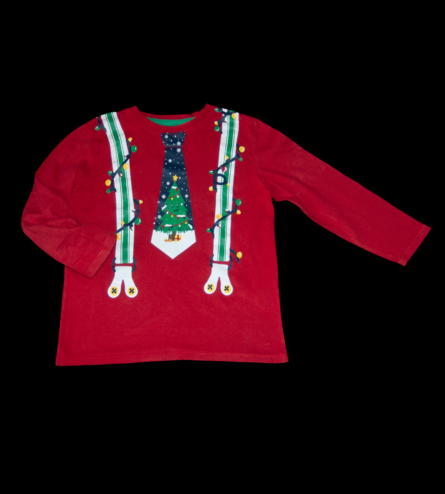 Triko zn. LITTLE KIDS, vel. 110 (4-5 let). Na advent, štědrý den, do školky, na besídku nebo Vaše vánoční focení. Triko je tmavší červené barvy s obrázkem vánoční kravaty se stromečkem a kšandami omotanými vánočními světýlky. Triko je v top stavu, dá se říct, že je jako nové bez visačky. Připravené k okamžitému odeslání.