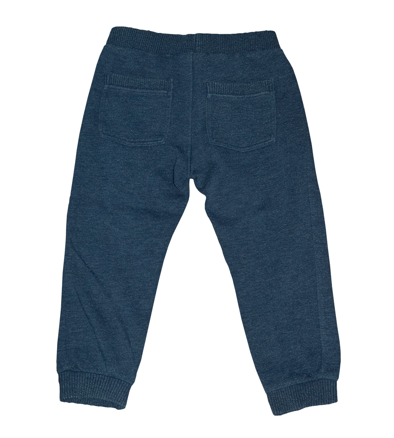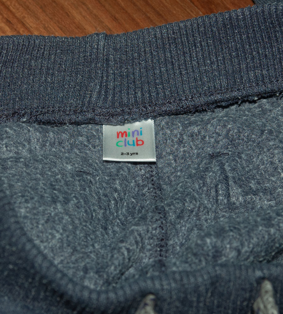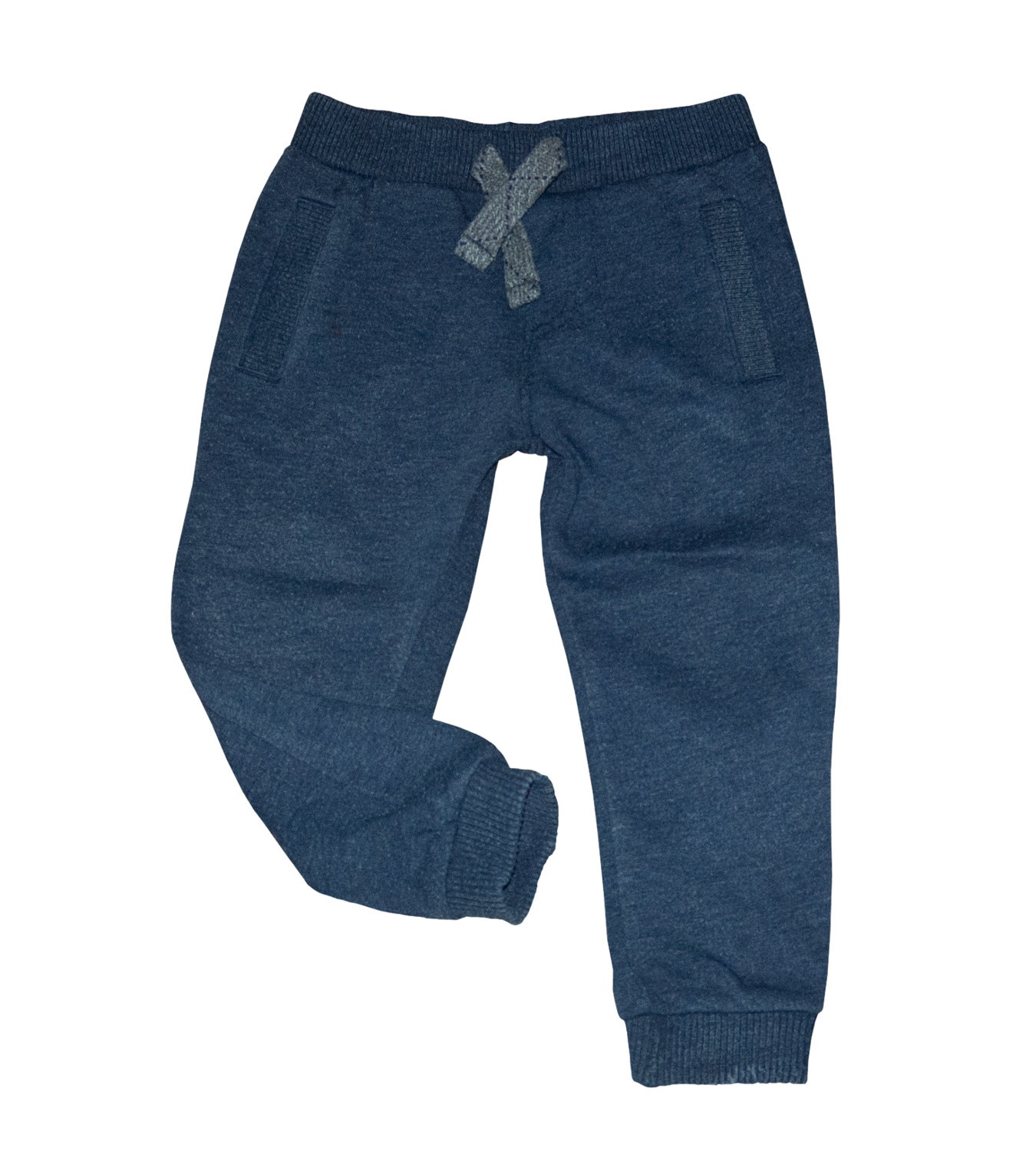 Tepláky zn. MINICLUB, vel. 98 (2-3 roky). Silné, kvalitní bavlna, zateplené chloupkem. Vpředu ze stran dvě šikmé kapsy a vzadu též dvě kapsičky, v pase širší guma a široká šňůrka jen pro ozdobu, falešný poklopec, zakončení nohavic do pružných manžet. Barva je štěrková modrá. Tepláky mají žmolíček od praní jinak jsou bez vad, připravené k okamžitému odeslání.