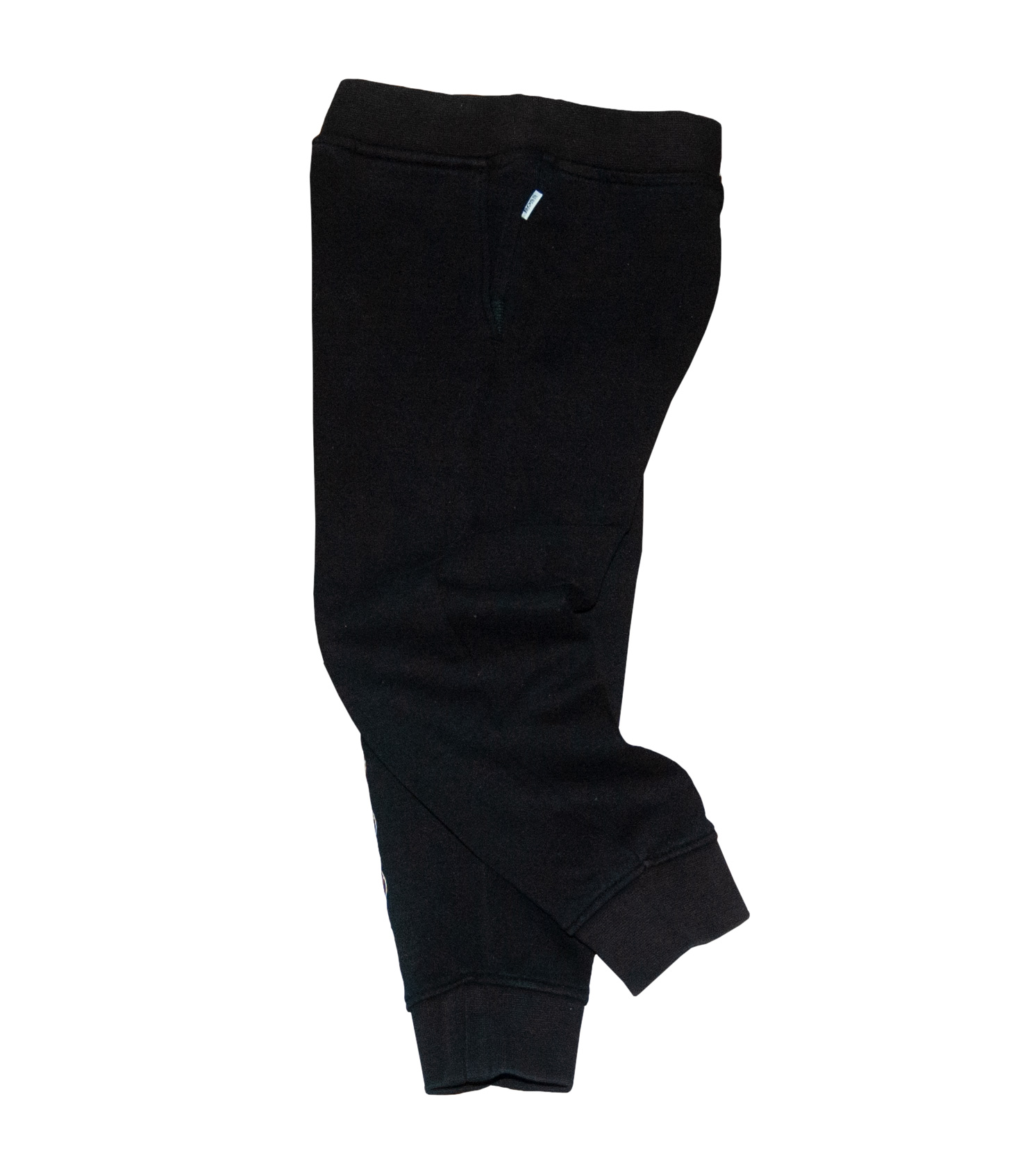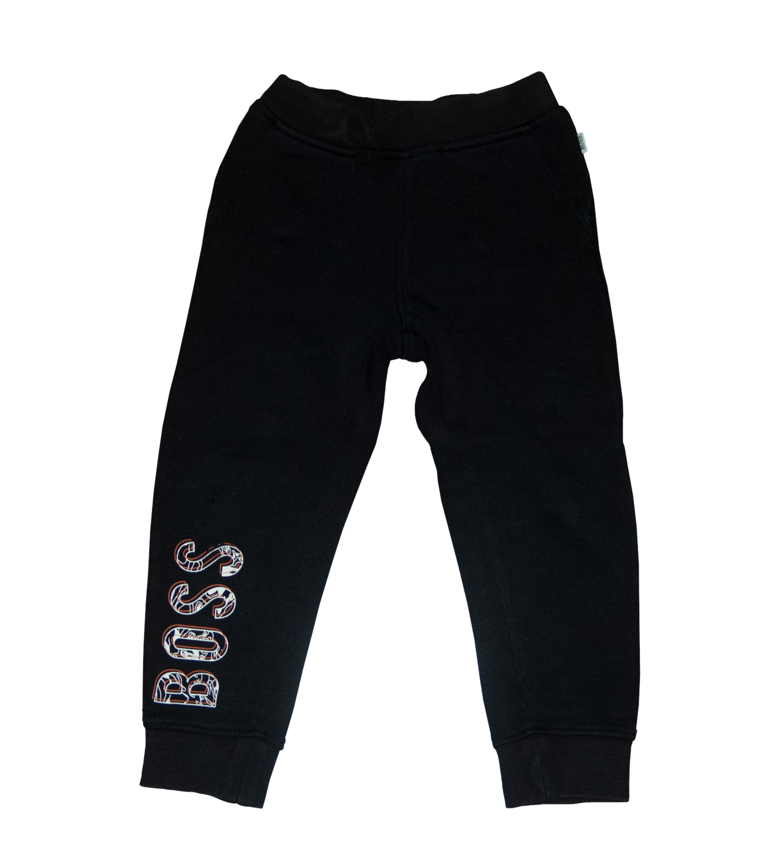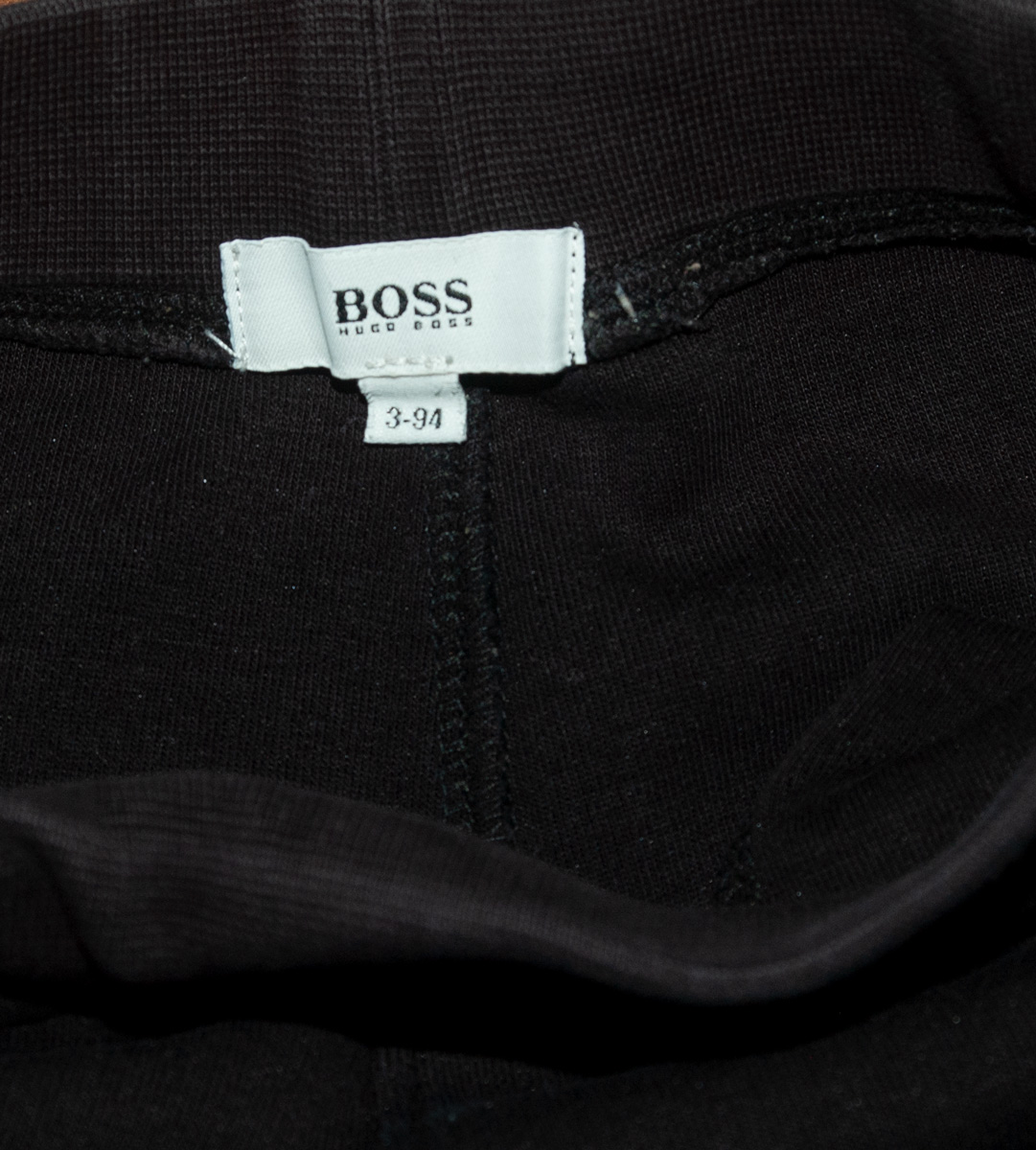 Tepláky zn. HUGO BOSS, vel. 98 (2-3 roky). Slabé, nezateplené, kvalitní bavlna. Vpředu dvě šikmé kapsy, v pase široká guma, zakončení nohavic do manžet. Barva je černá, na pravé nohavici nápis v bílooranžové barvě "BOSS", na levém boku štítek s nápisem "Boss". Tepláky jsou TOP stav jako nové, bez známek nošení, připravené k okamžitému odeslání.