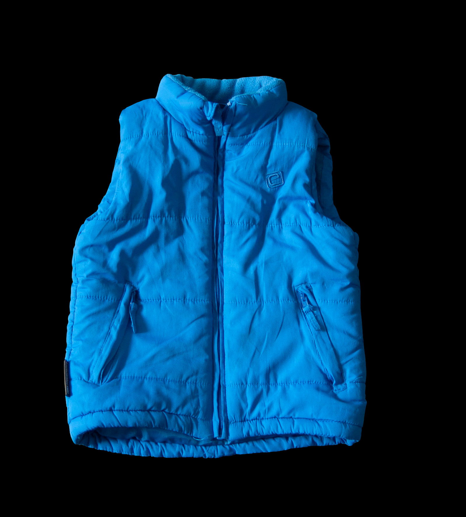 Podzimní/zimní vesta pro chlapce, který nerad nosí bundu a dává přednost vestě s mikinou, od zn. MOUNTAIN ESSENTIALS, vel. 116 (5-6 let). Zapínání na zip, který je u krku krytý légou (opatření proti skřípnutí). Vpředu dvě kapsy na zip, bez kapuce, límec je z modrého fleecu. Celá vesta je uvnitř zateplená vatelínem a je vodorovně prošitá ve volných širokých pruzích. Podšívka je z lesklé modré šusťákoviny, uvnitř jedna náprsní kapsa na suchý zip. Vepředu logo značky. Barva je modrá jasná. Pro představu na fotce figurína chlapec Ben (5 let, výška 110 cm). Vesta je v bezva stavu, slušivá, outdoorová. Připravená k okamžitému odeslání.