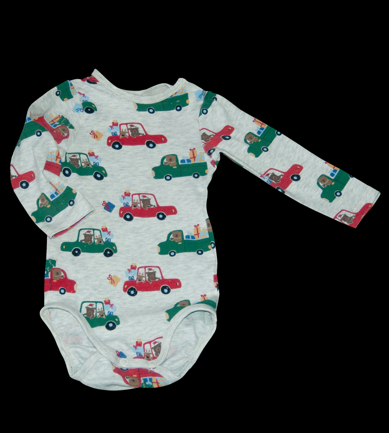 Body zn. H&M, vel. 74 (6-9 měs.). Autíčko plné dárků řídí méďa a veze soba. Rozepínání na tři patentky v rozkroku a jeden patentek na ramínku, kvůli snadnému oblékání přes hlavičku. Kolem nožiček je pružná nabíraná guma, krásně drží. Kvalitní materiál, šité v Bangladéši. Barva světle šedý melír, s převládajícími doplňky vánočních barev, červené a zelené. Top stav, bez vad, žádné známky nošení, připravené k okamžitému odeslání.