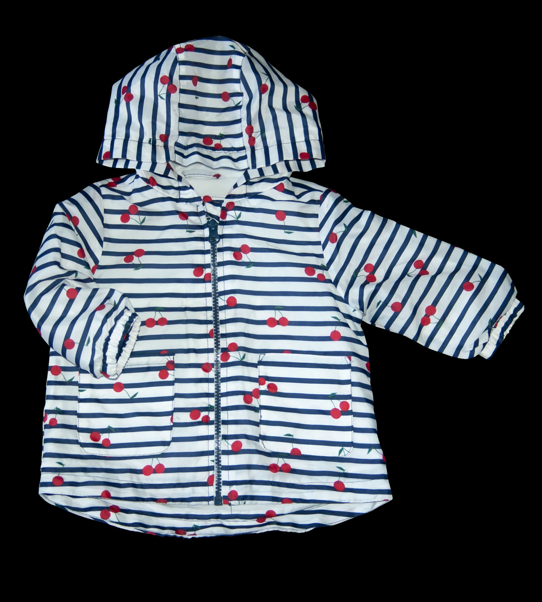 Jarní/podzimní bundička zn. PRIMARK, vel. 74 (6-9 měs.). Zapínání na zip, s kapucí. Zepředu dvě kapsičky. Bunda má teplou bílou fleecovou podšívku, včetně kapuce. Kapuce je součástí bundy, napevno přišitá. Rukávy jsou zakončeny nabíranou gumou. Zadní díl šitý jako delší do oblouku. V odstínu námořnického proužku (bílomodrá) s červenými třešněmi. Bunda není nošená, bez vad, připravená k okamžitému odeslání.