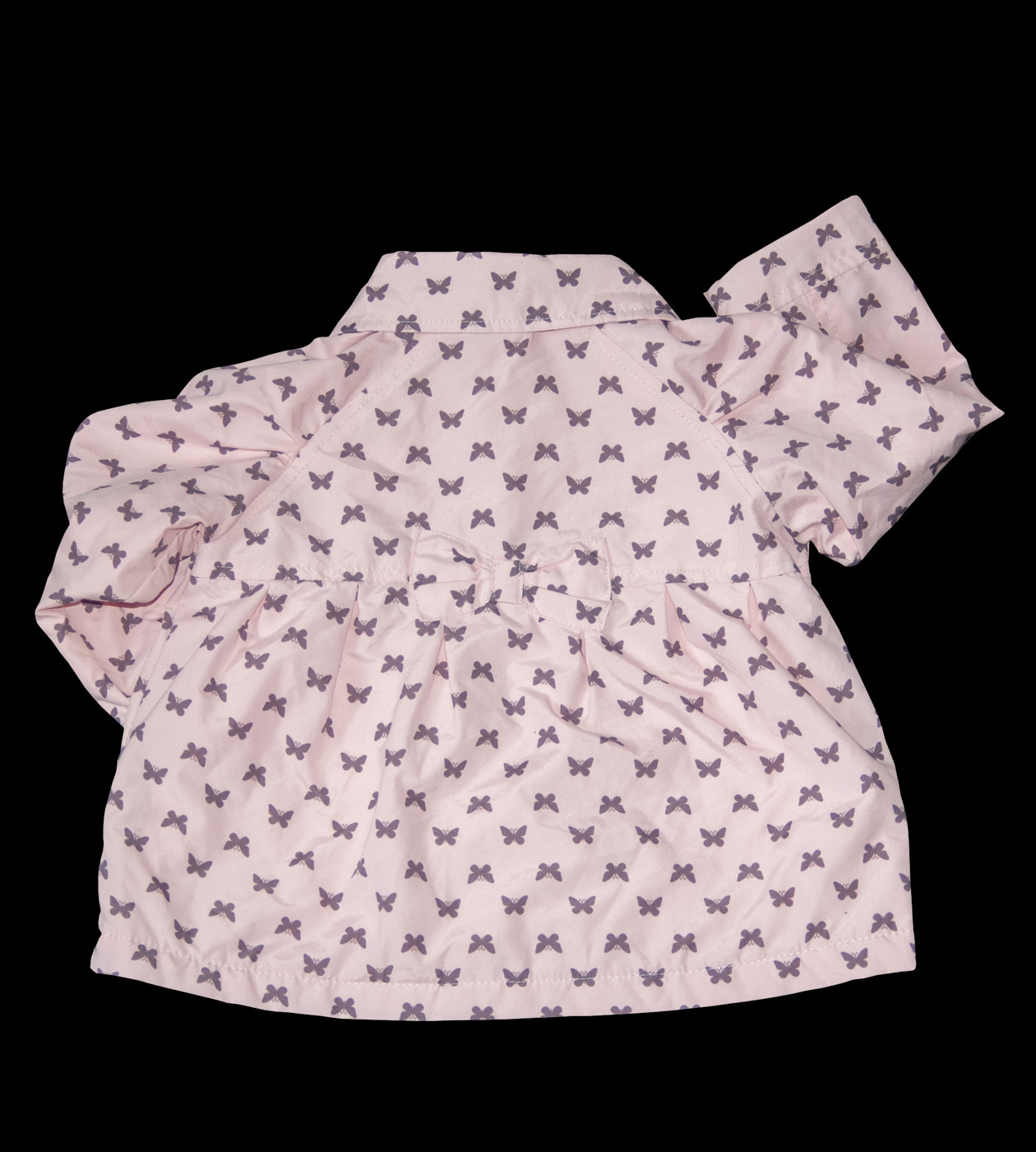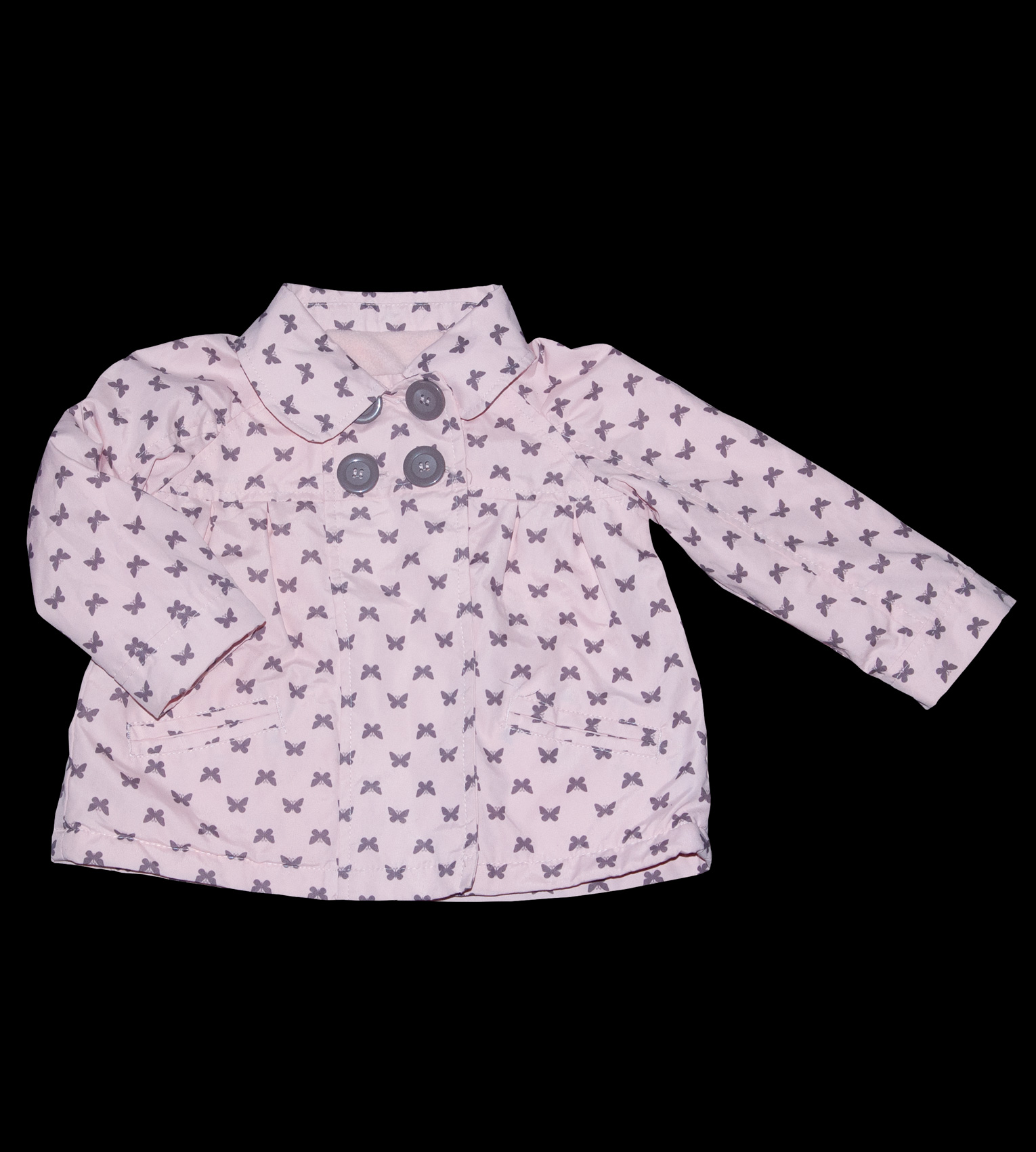 Jarní/podzimní kabátek zn. GEORGE, vel. 80 (9-12 měs.). Zapínání v horní části na čtyři knoflíky, dolů volný bez zapínání. Vpředu dvě šikmé kapsičky. Kabátek je lehoučký zateplený fleecovou podšívkou, rukávy bez zateplení. Rukávy jsou zakončeny volně, stejně tak kabátek. Šitý do střihu A (směrem dolů se rozšiřuje). Vzadu v místě přepásání mašlička. Barva je světle růžová se šedými motýlky a knoflíky. Je bez poničení jako nový, minimálně nošený. Připravený k okamžitému odeslání.