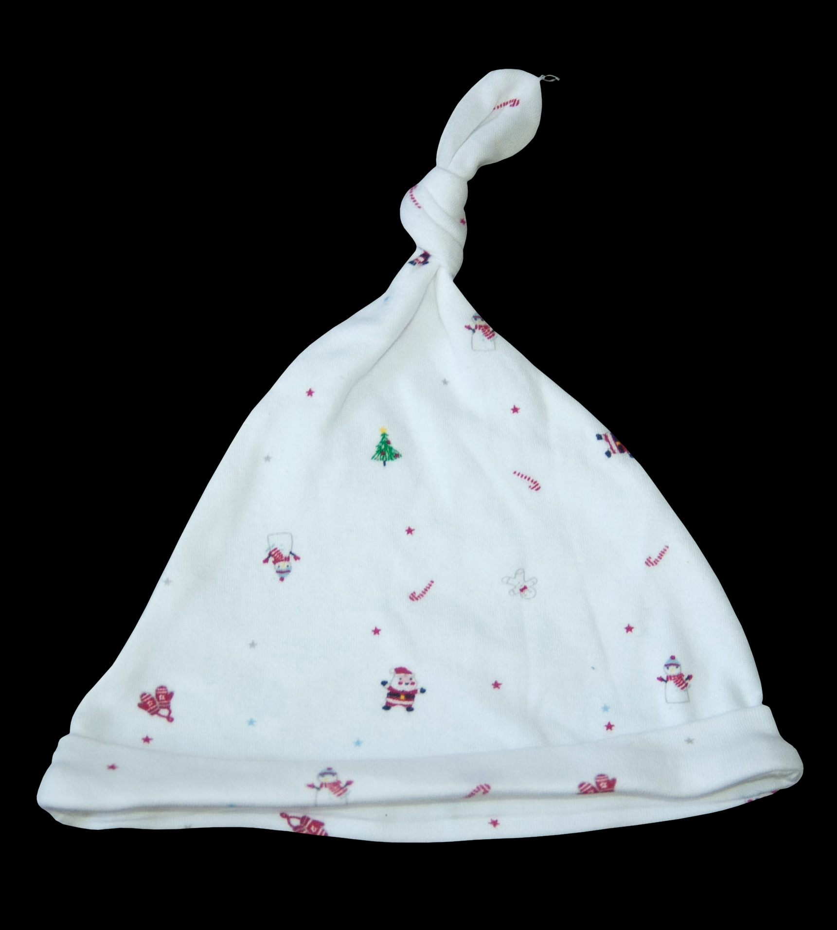Čepice pro elfíka nebo elfku s vánočním motivem zn. Mini Club vel. 74(6-9 měs.), dle dítka, měřte. Parádní na adventní dny, štědrý den, vánoční svátky, vánoční focení nebo jako vánoční dárek. Je slabá, bavlněná, vhodná ještě pod silnější zimní čepici. Barva je bílá s barevnými obrázky, stromečků, sněhuláků, hvězdiček, Santů atd. Na miminku roztomilá. Pro představu na fotce figurína chlapeček Hynek (novorozenec - měří 50 cm, obvod hlavy 34 cm), je mu větší, je to pro starší miminko od 6. měs., ale samozřejmě záleží na velikosti dítěte. Top stav, dá se říct nová bez visačky.
