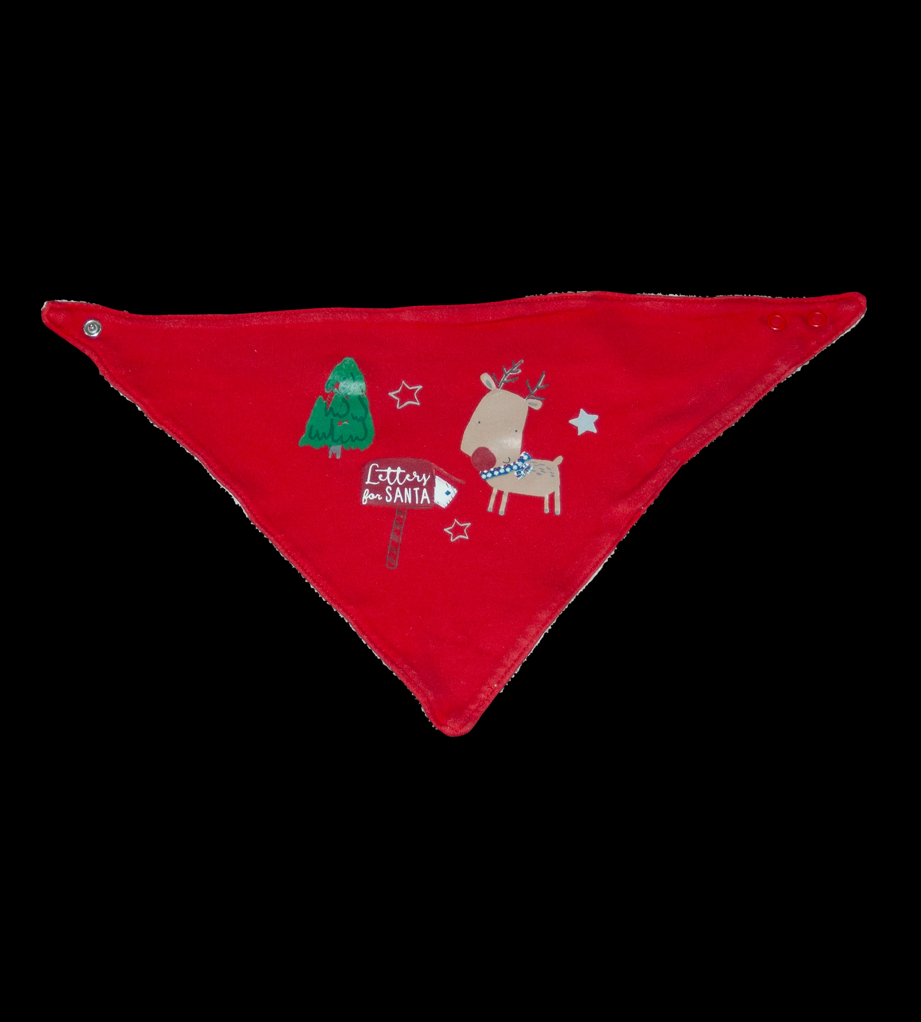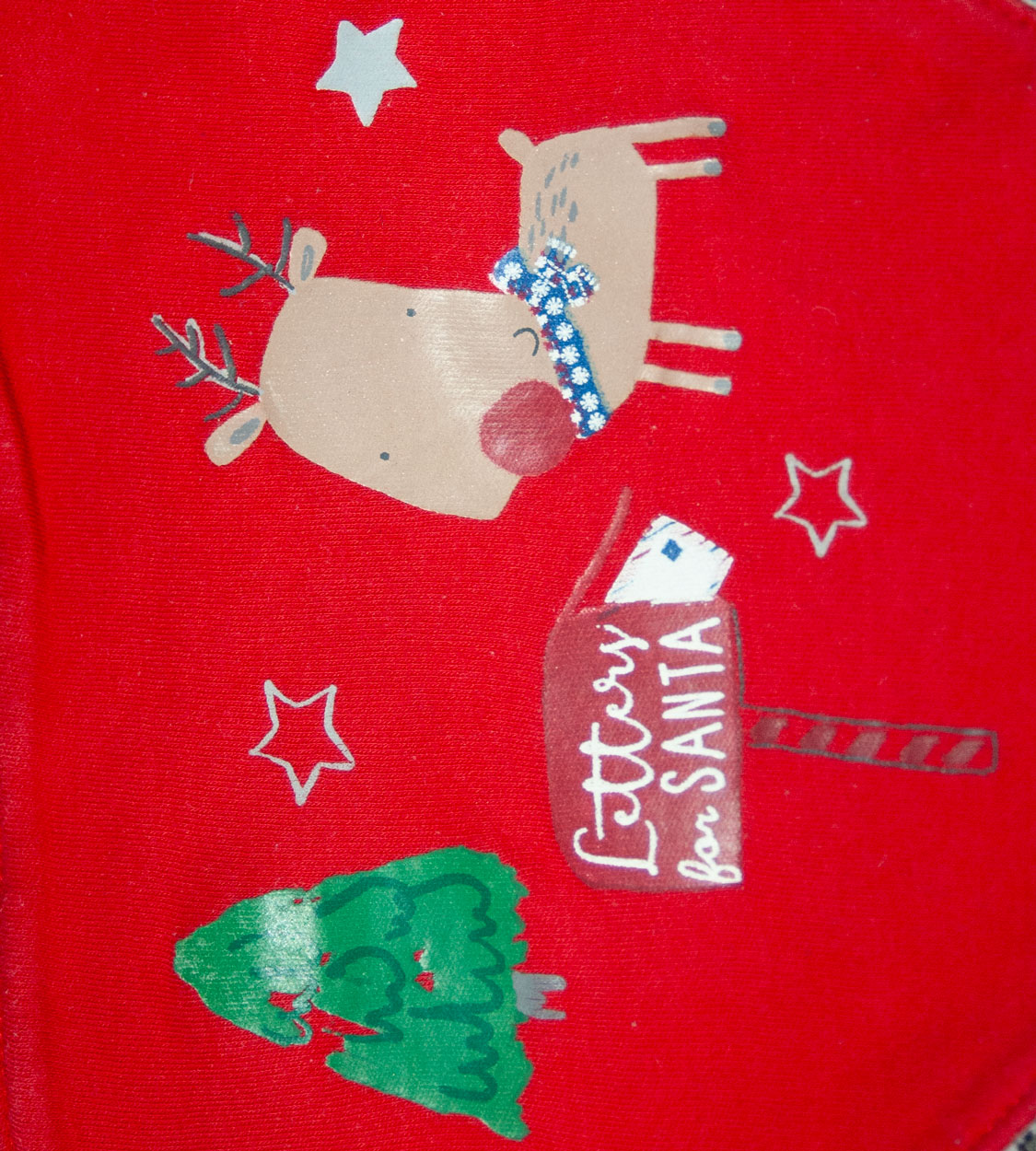 Stylový vánoční bryndáček pro miminko od zn. MATALAN, vel. ONE SIZE (pro všechny). Vánoční červená barva, obrázek (soba, plné poštovní schránky dopisů pro Santu, stromečku a hvězdiček), neměl by chybět u štědrovečerní večeře :). Zapínání na dva patentky, dle velikosti krčku dítěte. Materiál je silná bavlna, z rubu bílé froté. Šité v Egyptě, kvalitní. Top stav, nepoužívaný, chybí jen visačka.