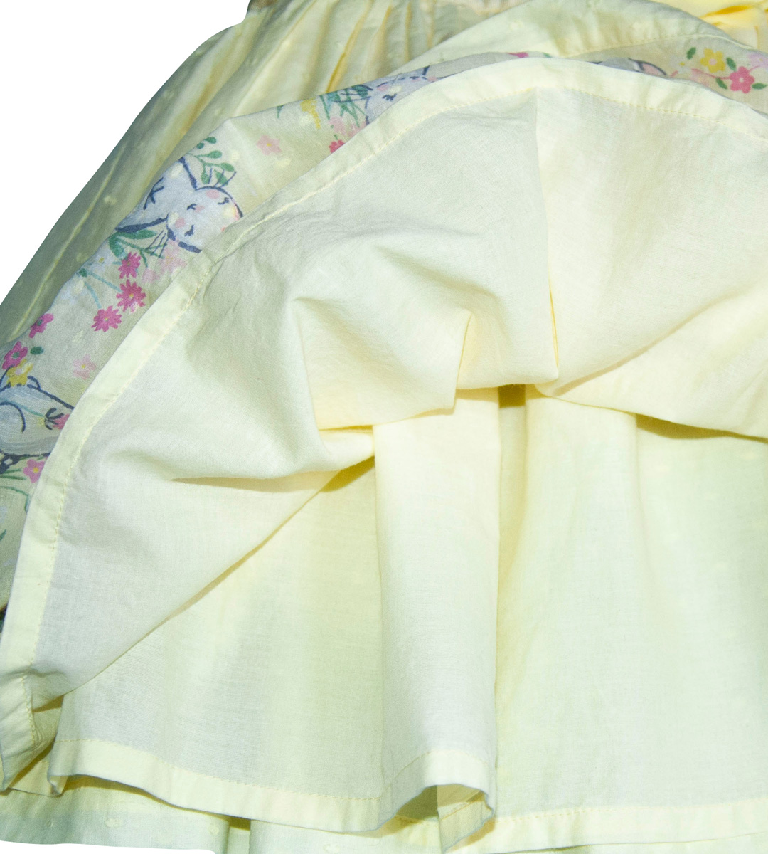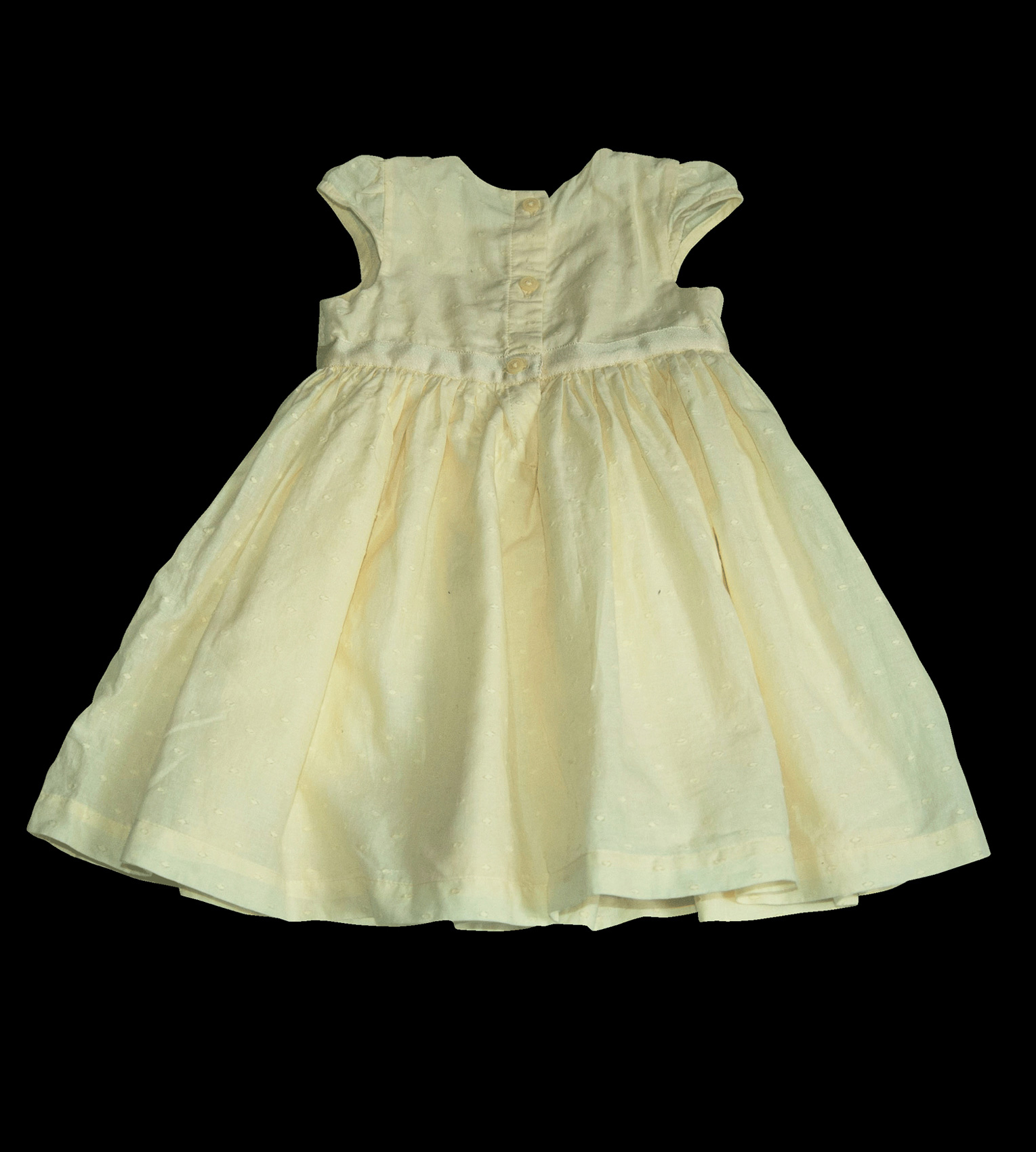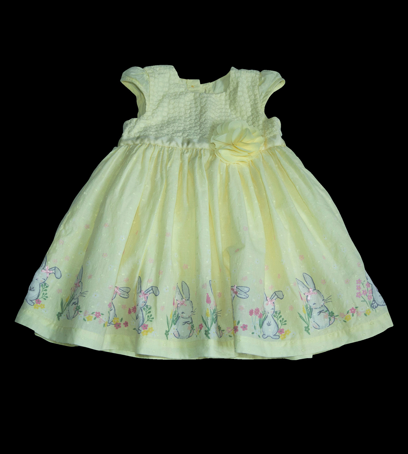 Roztomilé šaty, zn. GEORGE, vel. 80 (9-12 měs.). Šaty mají motýlkové rukávky, vpředu horní část je zdobená vyšívanými kytičkami, v pase po celém obvodu ozdobná stuha a na ní jedna velká šifonová růže, vzadu v horní polovině zapínání na tři knoflíky, mají bavlněnou (plátěnou) spodničku. Ve spodní přední části obrázky zajíčků s našitými mašličkami. Od pasu dolů jsou nabírané. Hodí se na jakoukoliv příležitost a nebo jen tak na běžné nošení. Jsou světlounce žluté, moc příjemné na těle a slušivé. Bezva stav, bez vady. Připraveny k okamžitému nošení.