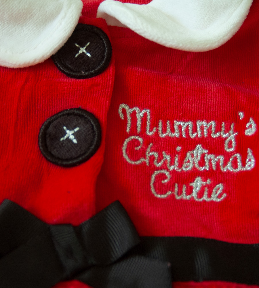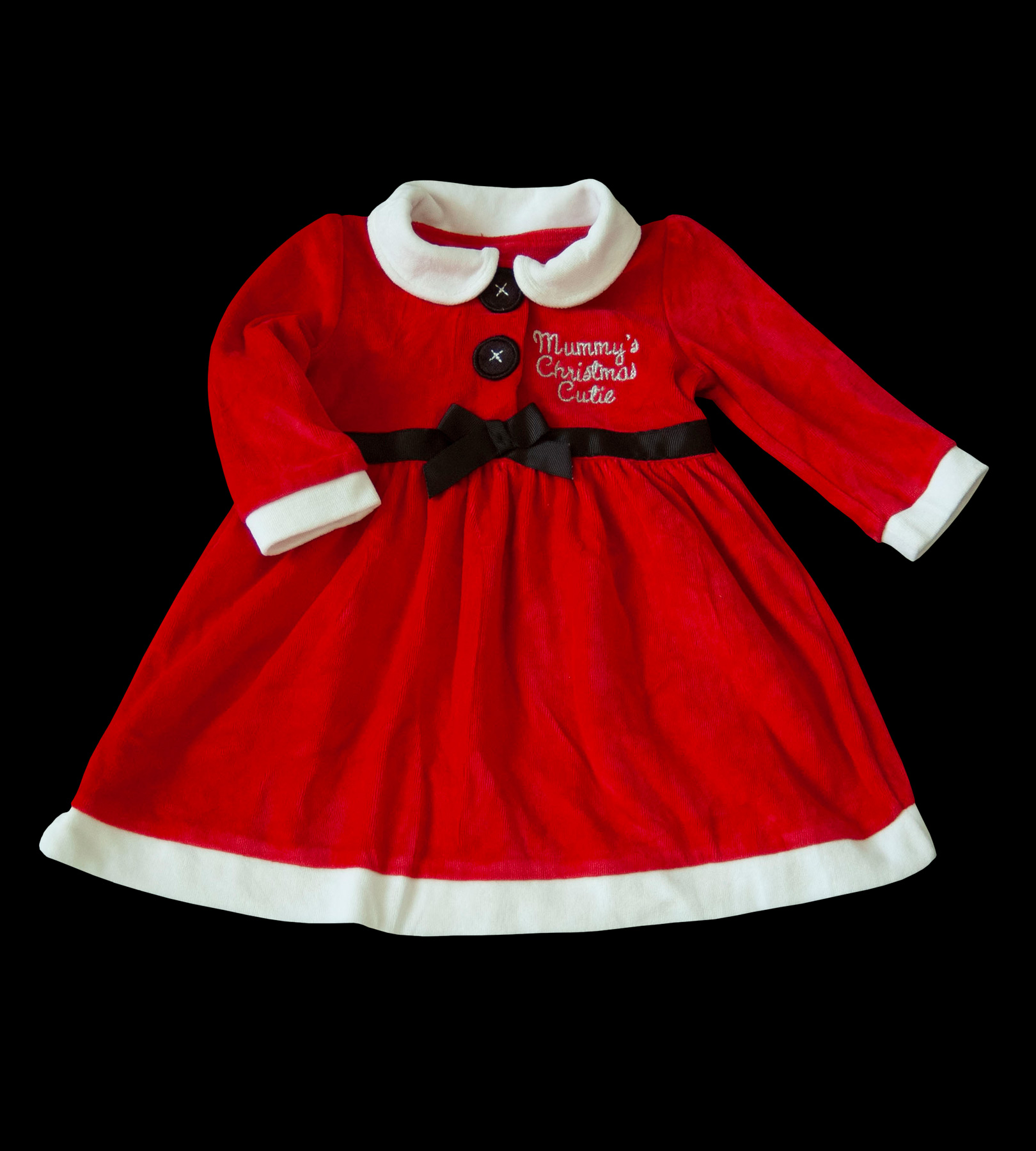 Semišové (velurové) šaty, zn. GEORGE vel. 74 (6-9 měs.). Oblékají se přes hlavu, vpředu zapínání do 1/3 na dva patentky. Na ramenou nabírané rukávky. Parádní na adventní dny, štědrý den, vánoční focení atd. Jsou jasně červené (santovské) barvy, v pase černá stužka s mašličkou, dva falešné knoflíky (zespodu jsou patentky), stříbrně vyšitý nápis "maminčin vánoční cukroušek". Klasický střih A (směrem dolů se rozšiřují). Velice příjemné na těle, měkoučký, heboučký velur. Jsou v top stavu, bez vad jako nové, dá se říct, že chybí jen visačka.