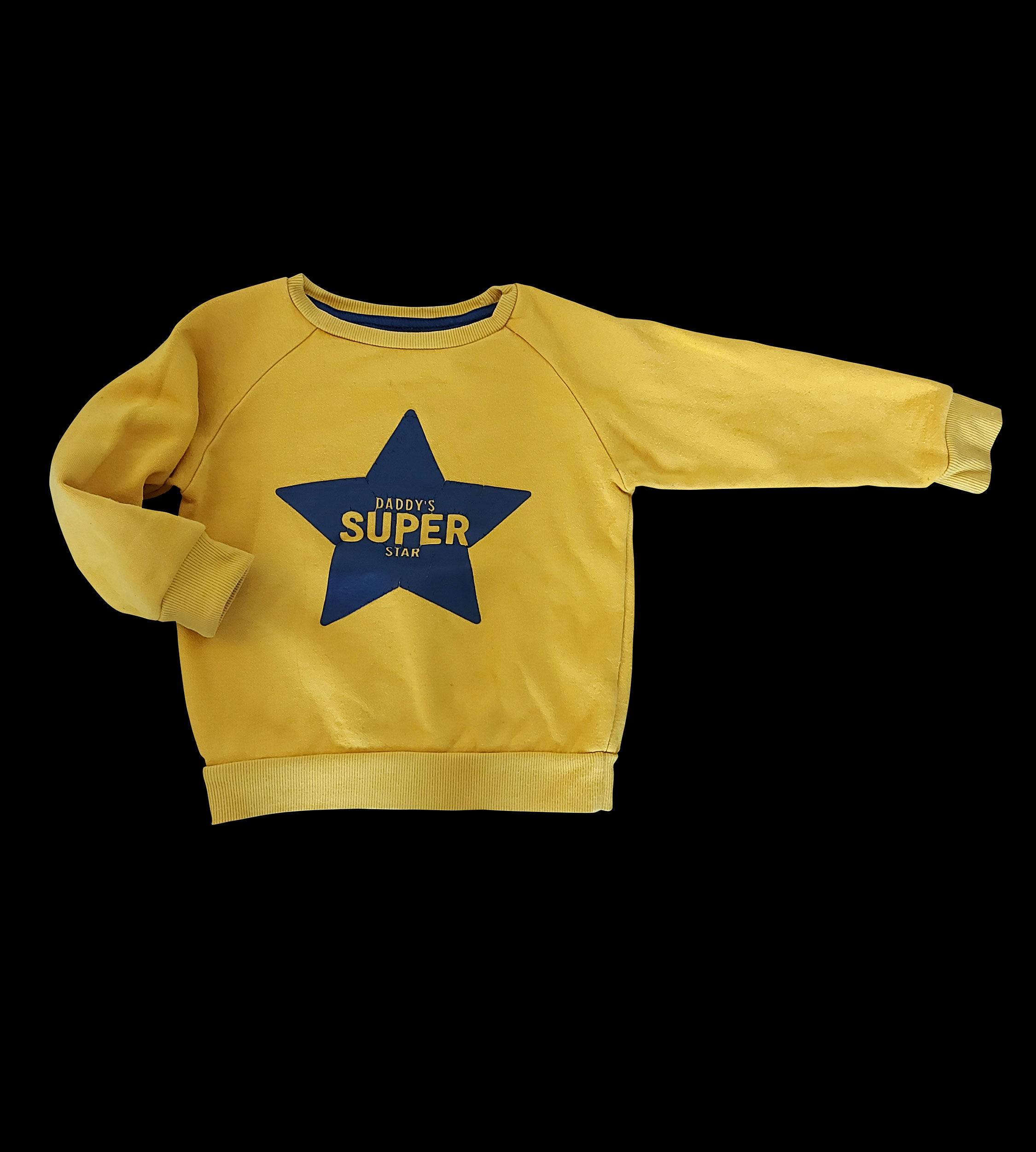 Mikina zn. PRIMARK, vel. 98 (2-3 roky). Jemně zateplená. Obléká se přes hlavu, bez kapes a kapuce. Žloutkově žlutá (tmavá žlutá) s tmavě modrou hvězdou a nápisem: "Tatínkova super STAR". Může nosit jak chlapeček, tak i holčička. Foceno před žehlením. Čistá, velice pěkný stav. Nyní je připravená k okamžitému odeslání a nošení.