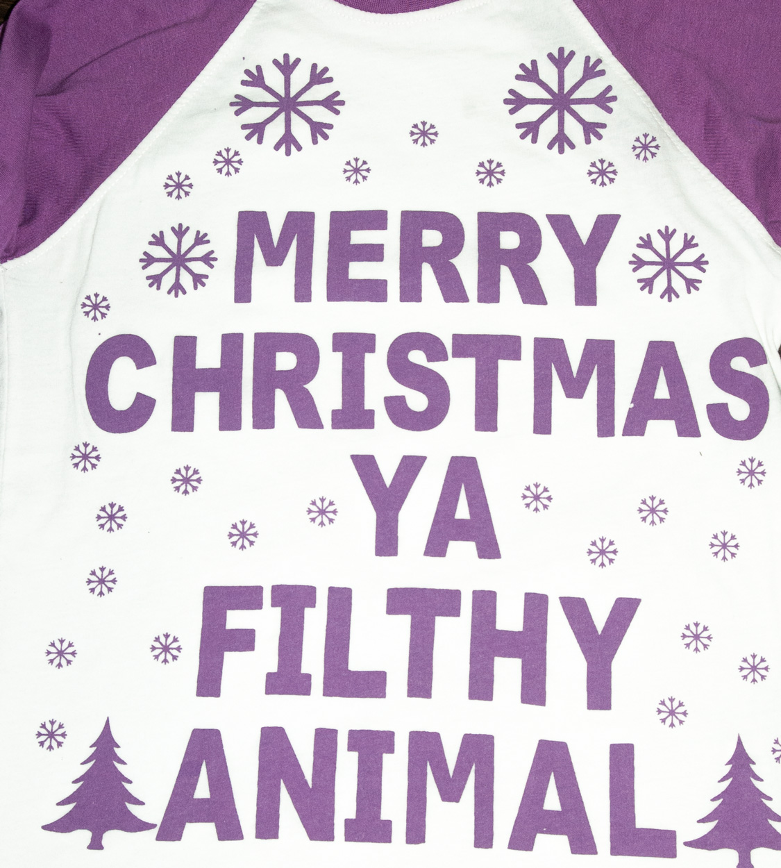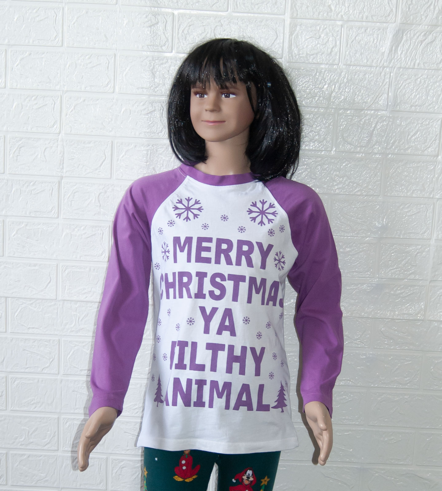 Triko zn. A2Z4-KIDS, vel. 140 (9-10 let). Tričko na advent, štědrý den, do školy a nebo na Vaše vánoční focení. Motiv vloček a vtipný nápis "štastné vánoce, ty špinavé zvíře". Pro představu na fotce figurína dívka Sophie (10 let, výška 140 cm). Barevná kombinace fialové a bílé. Dá se říct, že triko je nové bez visačky, připravené k okamžitému odeslání.