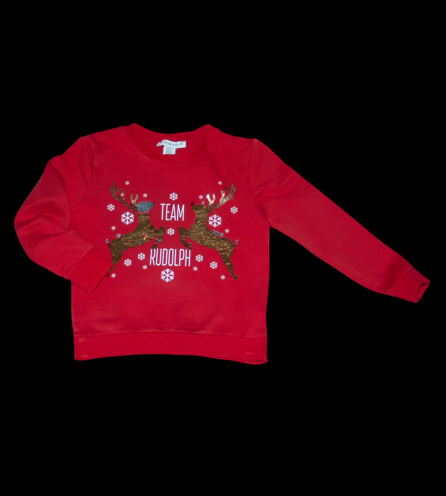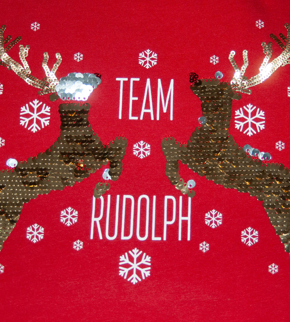 Triko zn. PRIMARK, vel. 104 (3-4 roky). Krásné tričko na advent, štědrý den, do školky, besídku nebo focení. Zimní motiv bílých vloček, zlatých sobů z flitrů (dají se změnit na barvu stříbrnou) a nápis "Rudolfův tým". Barva jasná červená. Může nosit dívka i chlapec, uni. Pro představu na fotce figurína dívka Elza (5 let, výška 110 cm), je vidět, že i ona triko obleče, menšímu dítku bude samozřejmě lépe. Dá se říct, že triko je jako nové bez visačky, žádné známky nošení. Vyrobeno v Turecku, kvalitní materiál, připravené k okamžitému odeslání.