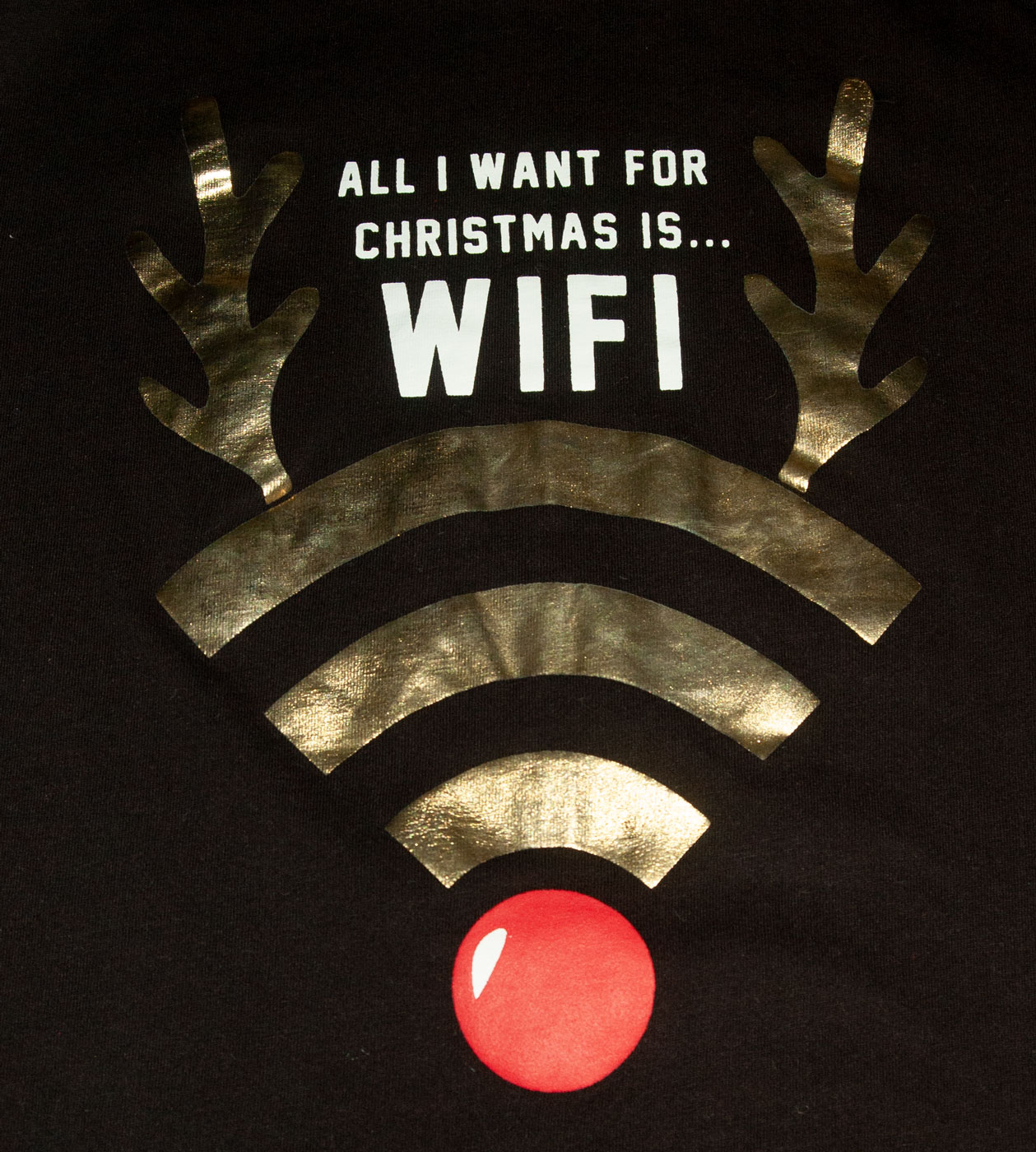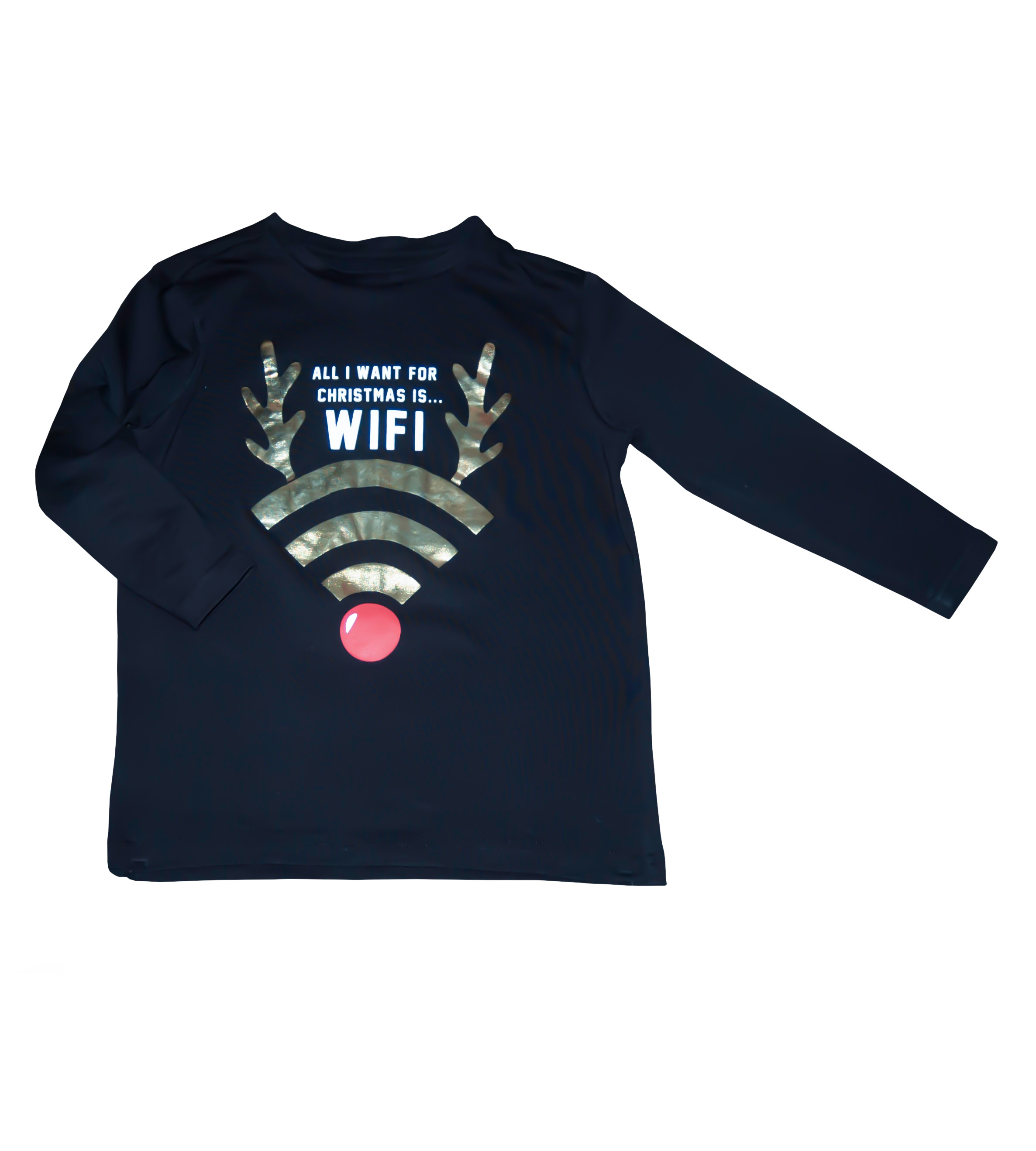 Triko zn. GEORGE, vel. 128 (7-8 let). Vtipné tričko na advent, štědrý den, do školy, besídku nebo focení. Motiv abstraktního zlatého soba představující wifi a nápis "Jediné, co chci k vánocům, je wifi". Barva jasná černá se zlatými doplňky a bílým nápisem. Může nosit dívka i chlapec, uni. Dá se říct, že triko je jako nové bez visačky, žádné známky nošení. Vyrobeno v Bangladéši, kvalitní materiál, připravené k okamžitému odeslání.