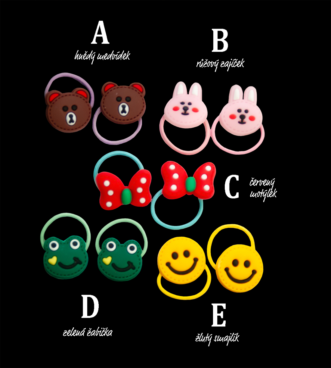 Hladké malé gumičky do vlasů s ozdobou, jsou měkké ve výrazných odtsínech, párové. Motiv zvířátek (medvídek, žabička, zajíček aj.). Cena je uvedena za celou originální sadu 10 ks (5 párů), lze různě kombinovat. Můžete zakoupit i jednotlivé páry, cena potom vychází 5.-/pár. Jedná se o nový produkt originálně balený, připravený k okamžitému odeslání.