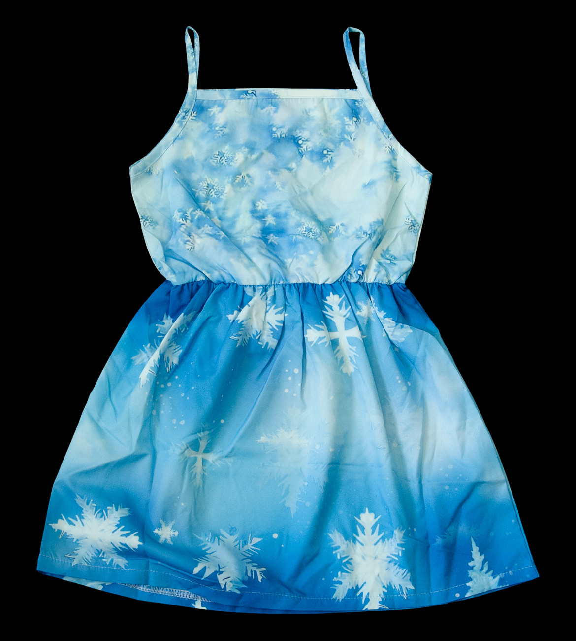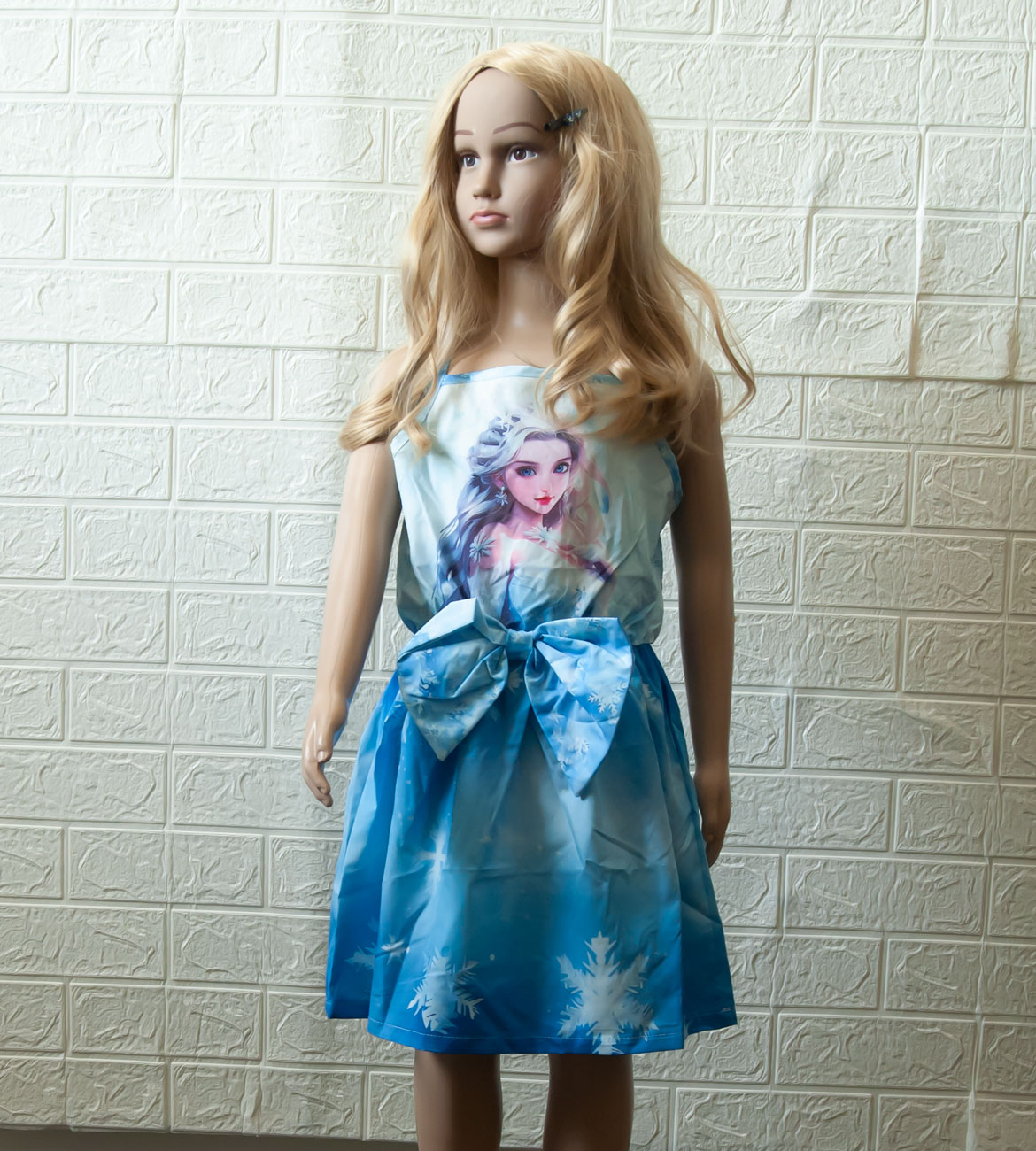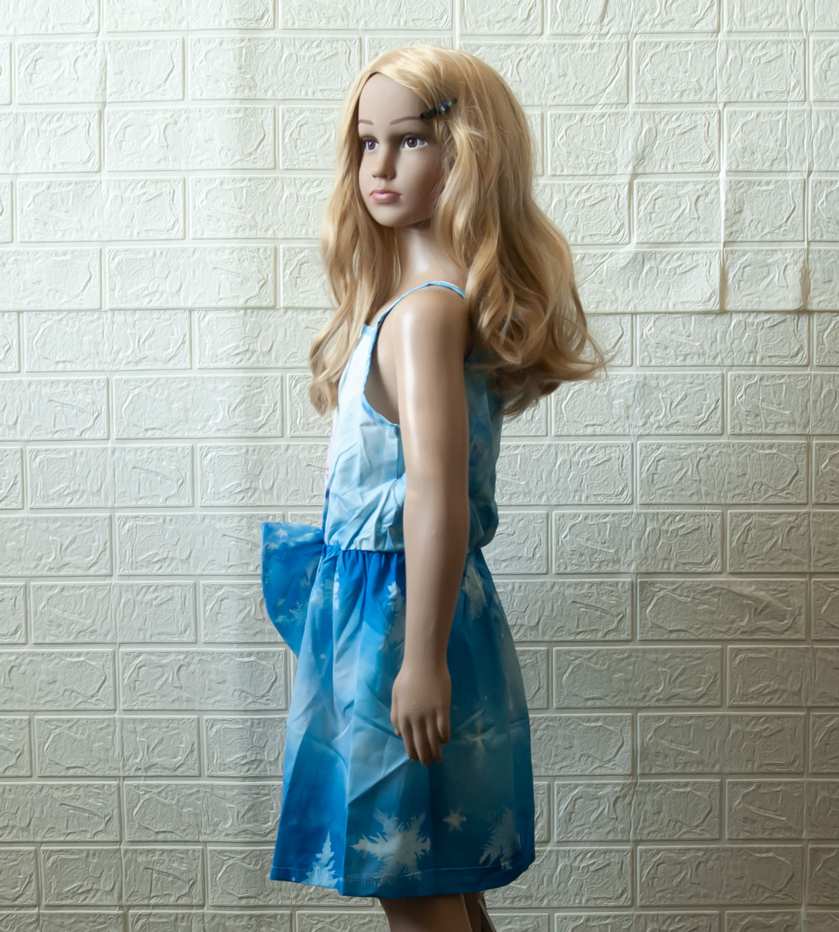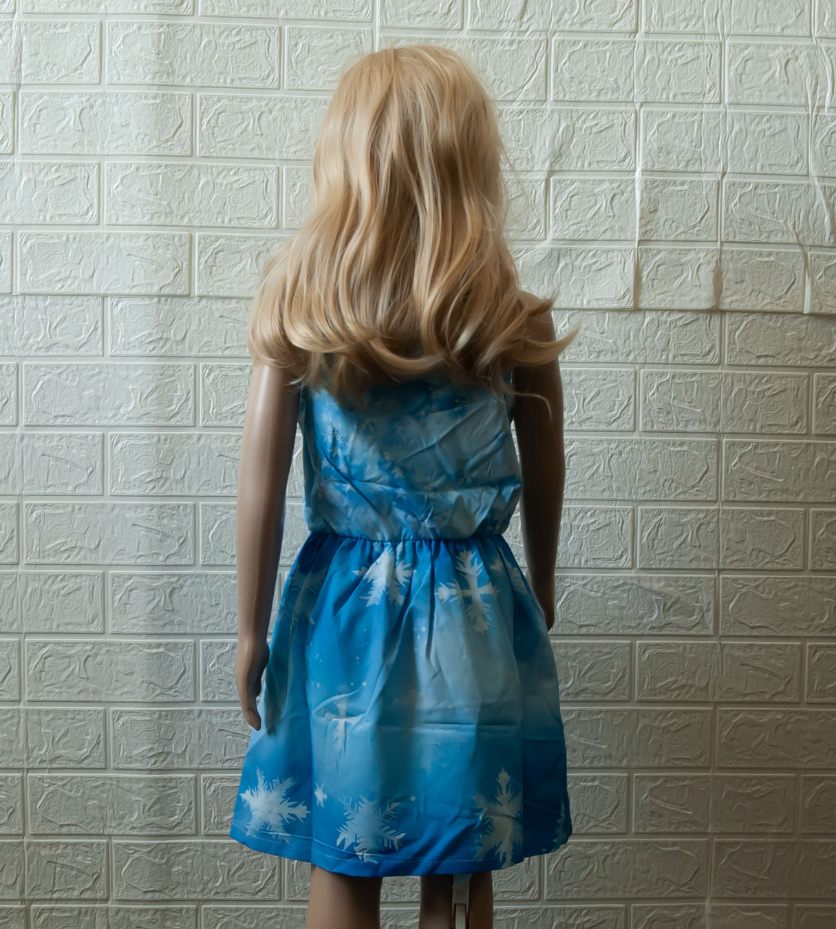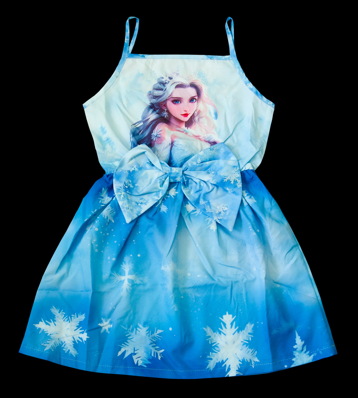 Šaty vel. 110 (4-5 let), budou dobře i starší drobné dívce, viz foto. Mají úzká ramínka, v pase nabíraná gumička a vpředu velká mašle. Šaty jsou lehoučké jako pavučinka, z velice příjemného chladivého materiálu, který na těle ani necítíte, ideální do horkých dnů. Barva studená modrá s vločkami a sněhem, v horní polovině velký obrázek Elzy. Pro představu na fotce figurína holčička Elza 5 let, výška 110 cm (míry Elzy: obvod hrudníku 55,5 cm, obvod pasu 50 cm, obvod boků 60 cm). NOVÉ originálně balené zboží, připravené k okamžitému odeslání.