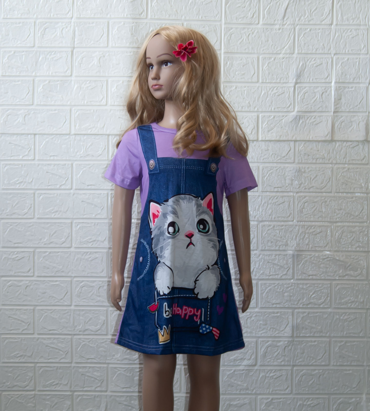 Šaty vel. 110 (4-5 let). Mají krátké rukávky, střih A (směrem dolů se rozšiřují), jednoduché, slušivé. Šaty jsou jemné a lehoučké, velice příjemný chladivý materiál. Jsou v barvě lila, s imitací tmavomodrého džínového laclu, velký obrázek koťátka v kapse. Pro představu na fotce figurína holčička Elza 5 let, výška 110 cm (míry Elzy: obvod hrudníku 55,5 cm, obvod pasu 50 cm, obvod boků 60 cm), má na sobě velikost 110. NOVÉ originálně balené zboží, připravené k okamžitému odeslání.