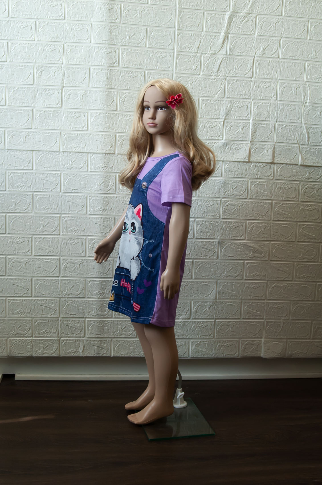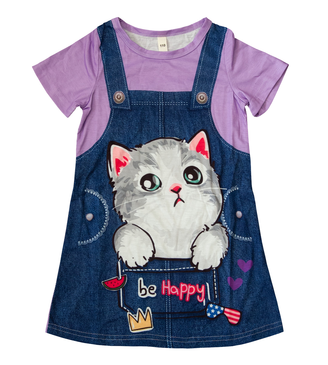 Šaty vel. 116/122 (5-7 let). Mají krátké rukávky, střih A (směrem dolů se rozšiřují), jednoduché, slušivé. Šaty jsou jemné a lehoučké, velice příjemný chladivý materiál. Jsou v barvě lila, s imitací tmavomodrého džínového laclu, velký obrázek koťátka v kapse. Pro představu na fotce figurína holčička Elza 5 let, výška 110 cm (míry Elzy: obvod hrudníku 55,5 cm, obvod pasu 50 cm, obvod boků 60 cm), má na sobě velikost 110. NOVÉ originálně balené zboží, připravené k okamžitému odeslání.
