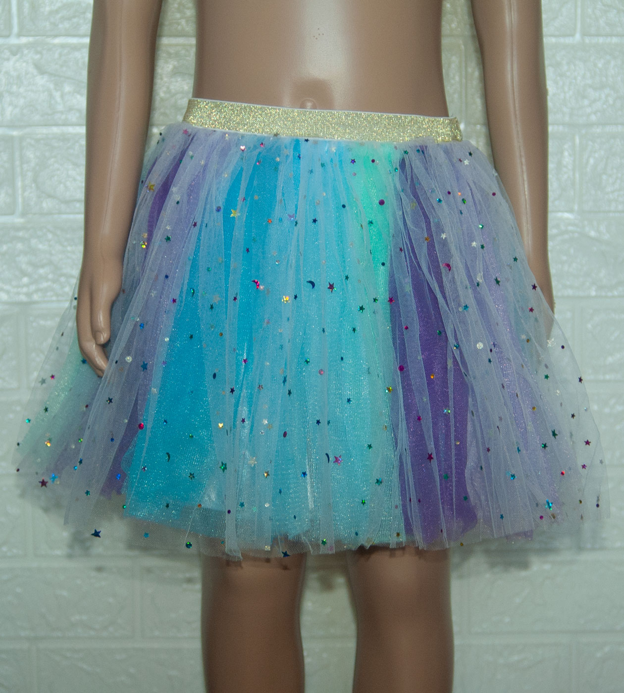 Nadýchaná vzdušná tutu sukénka pro každou balerínku, tanečnici, parádnici, vel. 116 (5-6 let). V pase dvojitá pružná guma, vyšívaná zlatou nití, skládá se ze čtyř vrstev. Spodní vrstva je bílá saténová podšívka, pak jsou barevné vrstvy a poslední je vrstva bílá, na které jsou barevné třpytivé flitry (hvězdičky, měsíčky, puntíky). Pro představu na fotce figurína holčička Elza 5 let, výška 110 cm (míry Elzy: obvod hrudníku 55,5 cm, obvod pasu 50 cm, obvod boků 60 cm), má na sobě velikost 116. NOVÉ originálně balené zboží, připravené k okamžitému odeslání.